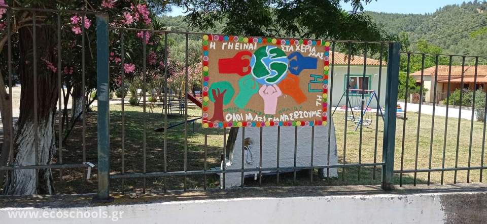Δημιουργήσαμε αφίσες με μηνύματα για τον πλανήτη και τη σωτηρία του, τις οποίες τοποθετήσαμε στην αυλή μας και στα κάγκελα του σχολείου μας με στόχο την αφύπνιση και τον προβληματισμό των επισκεπτών .