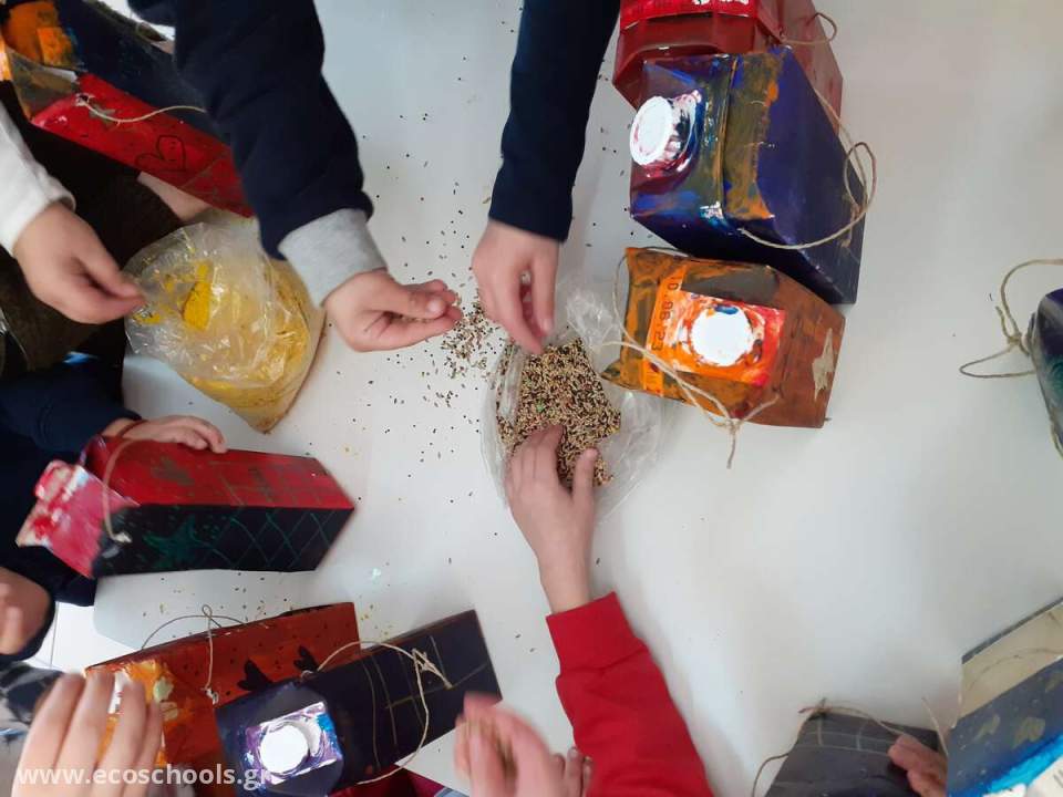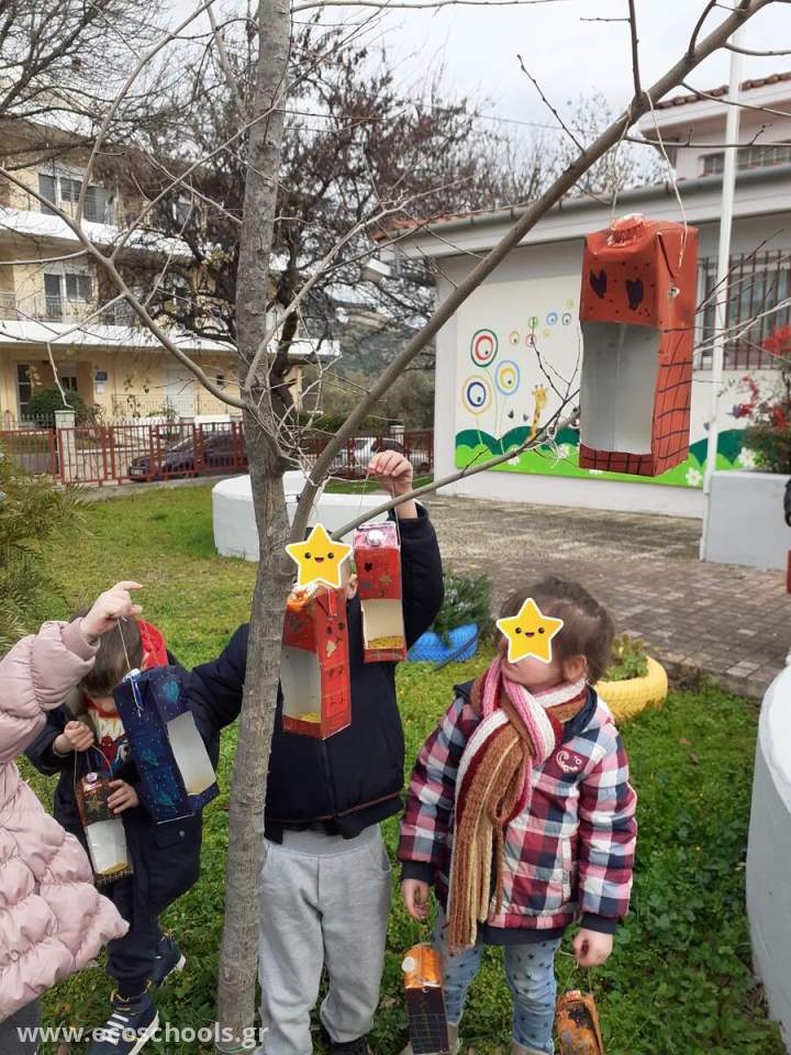 Όπως ανακαλύψαμε τα πουλιά που έρχονται πιο συχνά στην αυλή μας είναι οι καρακάξες. Συζητήσαμε για τη δυσκολία των πουλιών τους χειμερινούς μήνες να βρουν τροφή και τα παιδιά ευαισθητοποιήθηκαν κι ετοίμασαν μοναδικές ταϊστρες για τα πουλιά της αυλής μας. Αξιοποίησαν άχρηστο υλικό(κουτιά από γάλα και χυμούς)τα έβαψαν, τα διακόσμησαν και έφτιαξαν πανέμορφες ταίστρες τις οποίες γέμισαν με τροφή και τις τοποθέτησαν στα δέντρα μας .Σχολική αυλή και ανακύκλωση -επαναχρησιμοποίηση συνδυάστηκαν ιδανικά!