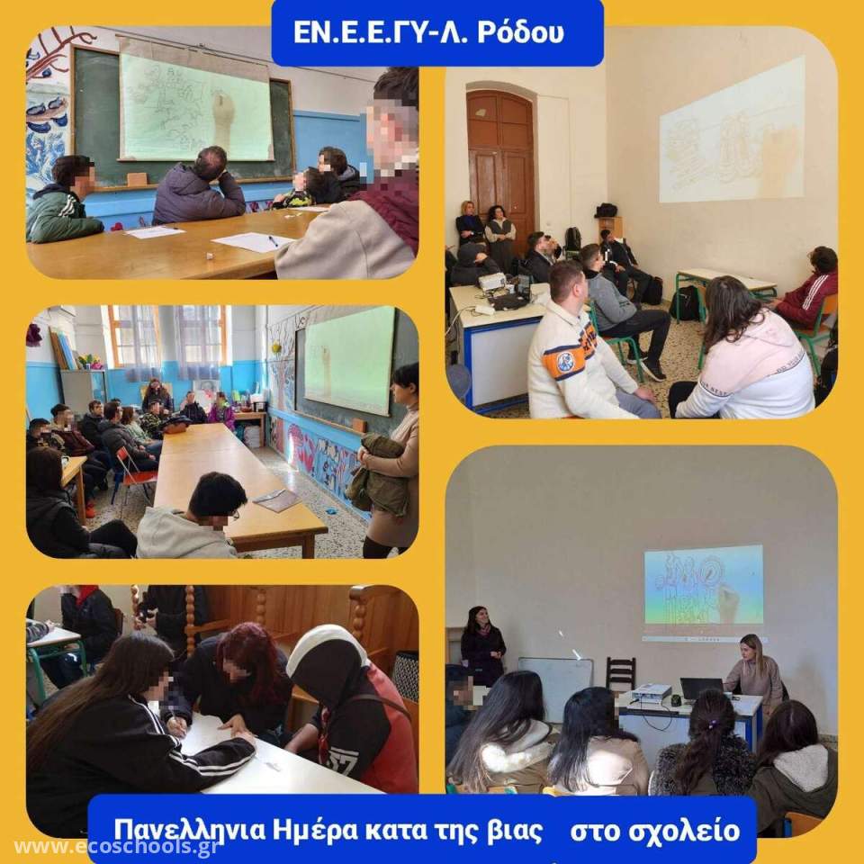 Με αφορμή την 6η Μαρτίου, Πανελλήνια Ημέρα κατά της βίας στο σχολείο, την Παρασκευή 10 Μαρτίου 2023 πραγματοποιήθηκε βιωματική δράση προκειμένου μαθητές και εκπαιδευτικοί του ΕΝ.Ε.Ε.ΓΥ.-Λ Ρόδου να ανταλλάξουν σκέψεις, πληροφορίες, ιδέες γύρω από το φαινόμενο της σχολικής βίας και του εκφοβισμού.