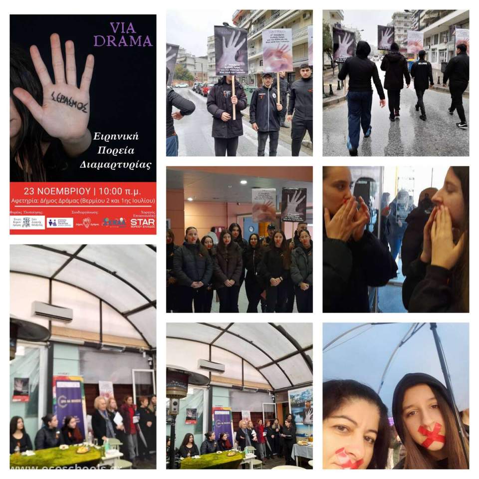 Στο πλαίσιο των εκδηλώσεων του Viadrama, πραγματοποιήθηκε την Πέμπτη 23 Νοεμβρίου ειρηνική πορεία διαμαρτυρίας σε κεντρικά σημεία της πόλης μας. Οι συμμετέχουσες είχαν καλυμμένο συμβολικά το στόμα τους με μια κόκκινη ταινία, ως ένδειξη συμπαράστασης απέναντι στα θύματα βίας, ενώ οι νεαροί μαθητές μας μετέφεραν πλακάτ με μηνύματα για την ημέρα αυτή