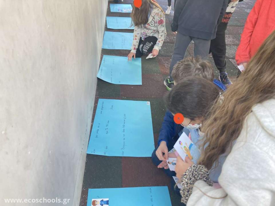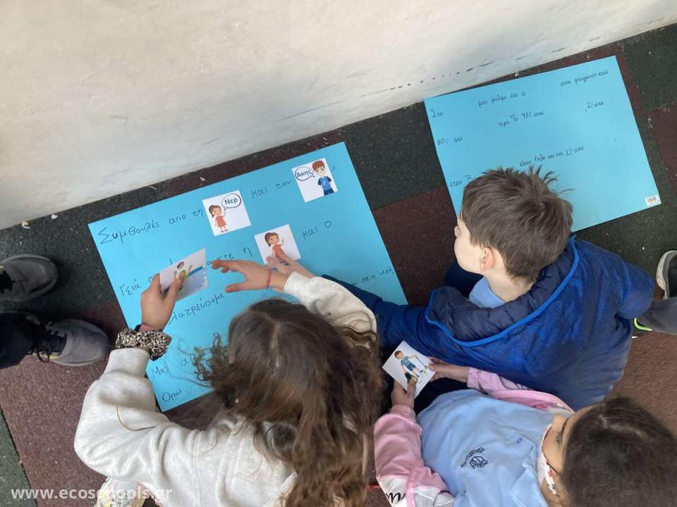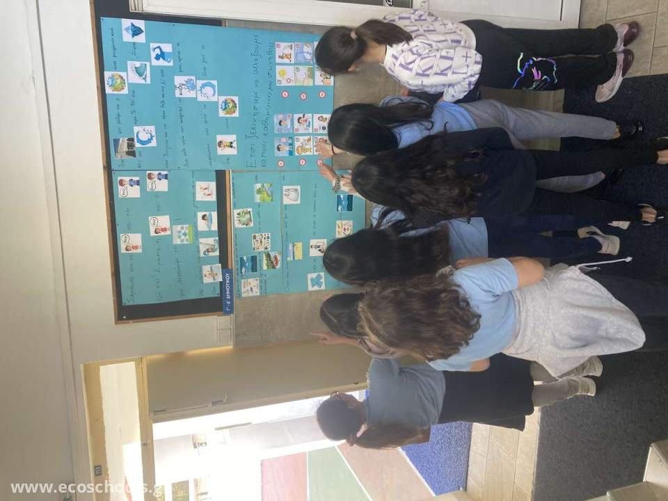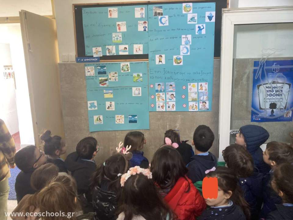 Οι μαθητές της Δ´ Δημοτικού μαζί με τη δασκάλα τους συζήτησαν για την αξία του νερού στη ζωή μας και για τη σπουδαιότητα της εξοικονόμησής του. Μετά κατασκεύασαν αφίσες ενημέρωσης και ευαισθητοποίησης σχετικά με την εξοικονόμηση νερού. Τις αφίσες τοιχοκόλλησαν στον πιο πολυσύχναστο χώρο του Σχολείου, ώστε να γίνονται αντιληπτές από τους περισσότερους μαθητές (μικρούς και μεγάλους) του σχολείου.