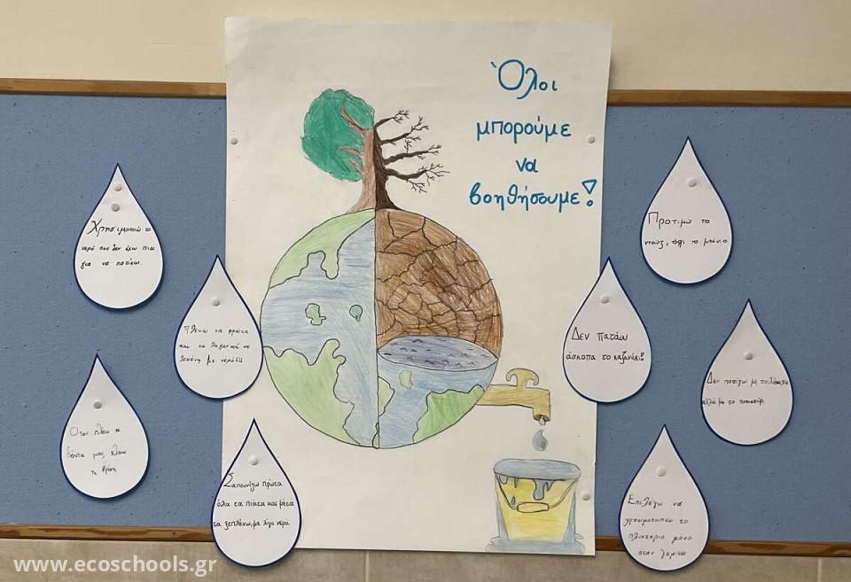 Στα πλαίσια του φετινού θέματος των Οικολογικών Σχολείων, το οποίο είναι το νερό, οι μαθητές της Δ’ Δημοτικού ασχολήθηκαν με τους τρόπους εξοικονόμησης αυτού. Αφού ευαισθητοποιήθηκαν και προβληματίστηκαν για τη σπατάλη των υδάτινων πόρων, σκέφτηκαν απλές συνήθειες που μπορούμε όλοι να εντάξουμε στην καθημερινότητά μας και να συνεισφέρουμε στον σκοπό αυτό.