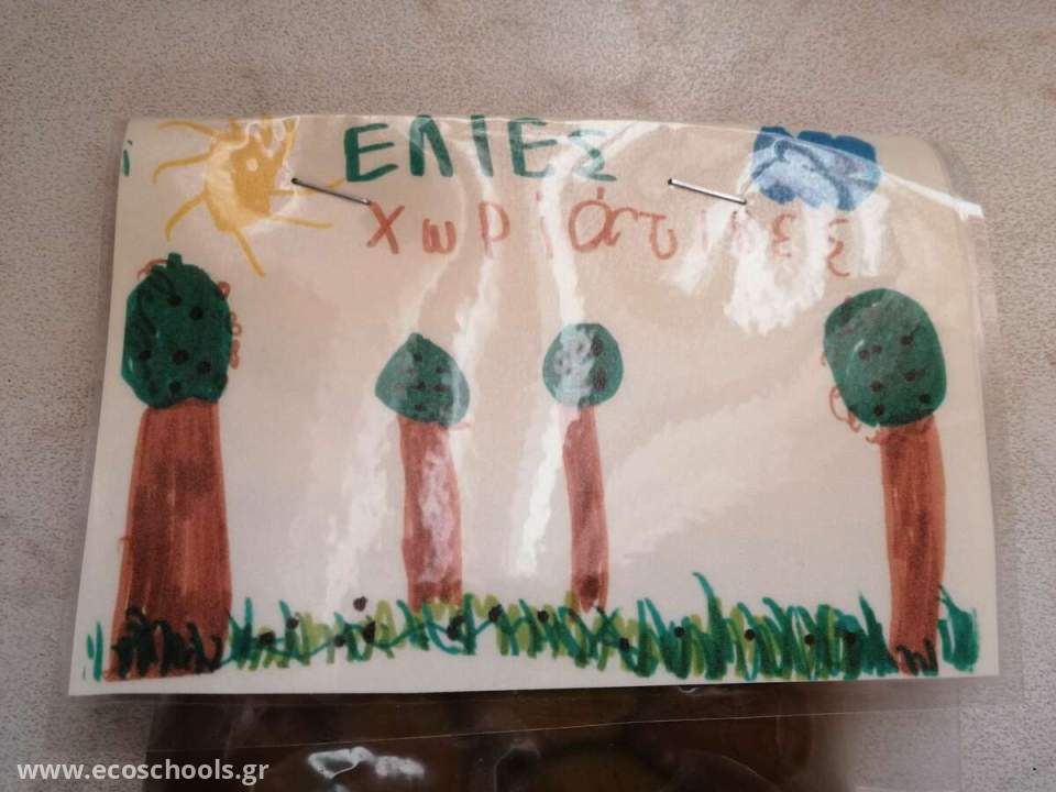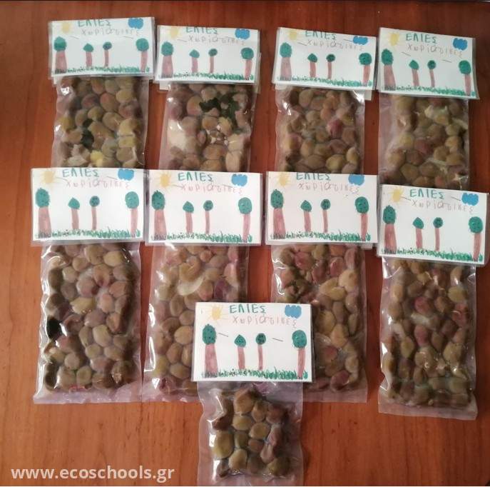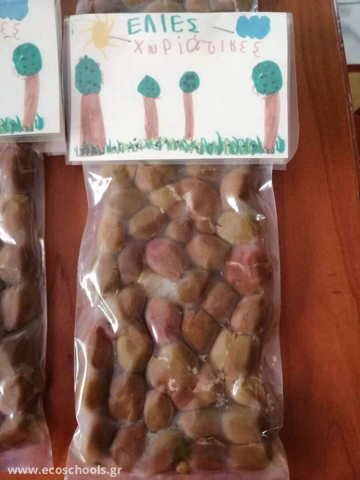 Τις μαζέψαμε , τις ξεχωρίσαμε , τις χτυπήσαμε , τις αλλάξαμε νερό , βάλαμε μυρωδικά και τις βάλαμε σε συσκευασία . Αποφασίσαμε για το όνομα της ετικέτας , ζωγραφίσαμε , ψηφίσαμε και έτοιμες και φέτος οι ελιές μας.