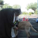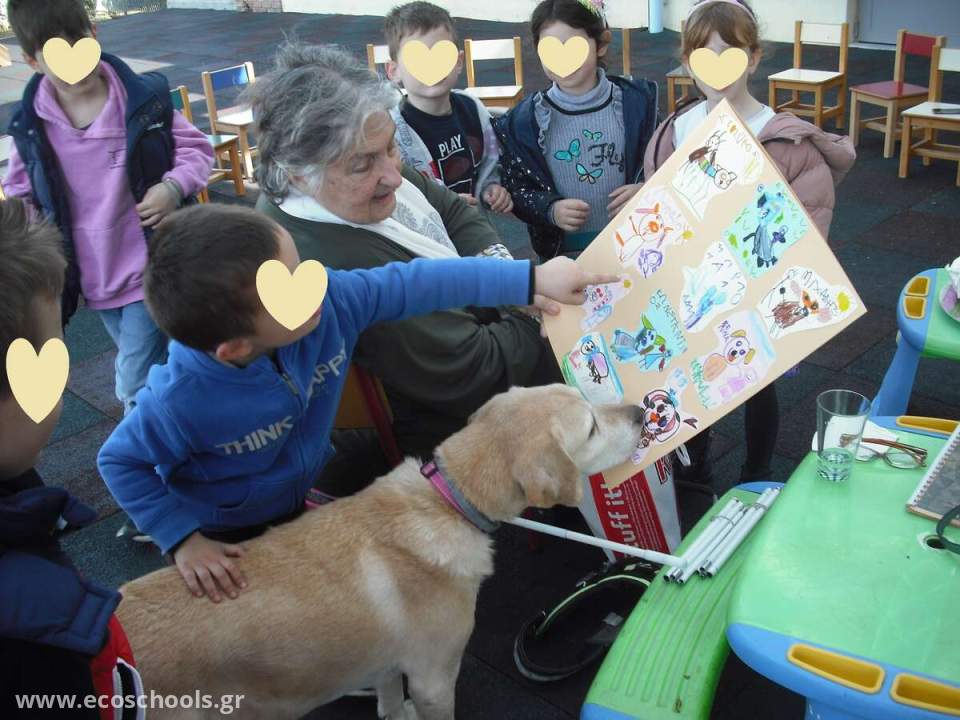 Με μεγάλη χαρά και ιδιαίτερο ενθουσιασμό υποδεχτήκαμε στο σχολείο μας την πρόεδρο του Ελληνικού Κέντρου Σκύλων Οδηγών Ελλάδος κυρία Ζωή Γερουλάνου με τη σκυλίτσα Ίρμα. Κατά τη διάρκεια της επίσκεψής τους στο σχολείο μας τα παιδιά πληροφορήθηκαν τι είναι ο σκύλος οδηγός και πώς από μικρό κουτάβι ακόμα περνάει πολλά και διαφορετικά στάδια εκπαίδευσης. Οι μαθητές είχαν επίσης την ευκαιρία να χρησιμοποιήσουν το λευκό μπαστούνι και να περπατήσουν δίπλα στην Ίρμα η οποία φορώντας το ειδικό γιλέκο με τη λαβή οδήγησε τα παιδιά σε μια μικρή διαδρομή αποφεύγοντας διάφορα εμπόδια. Όταν ολοκλήρωσε το έργο της και αφού αφαιρέθηκε το γιλέκο η Ίρμα απόλαυσε τα χάδια των παιδιών και δέχτηκε με χαρά και την κάρτα που της ετοίμασαν. Η συνάντησή μας με την κυρία Γερουλάνου και τη σκυλίτσα Ίρμα θα μας μείνει αξέχαστη.