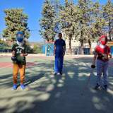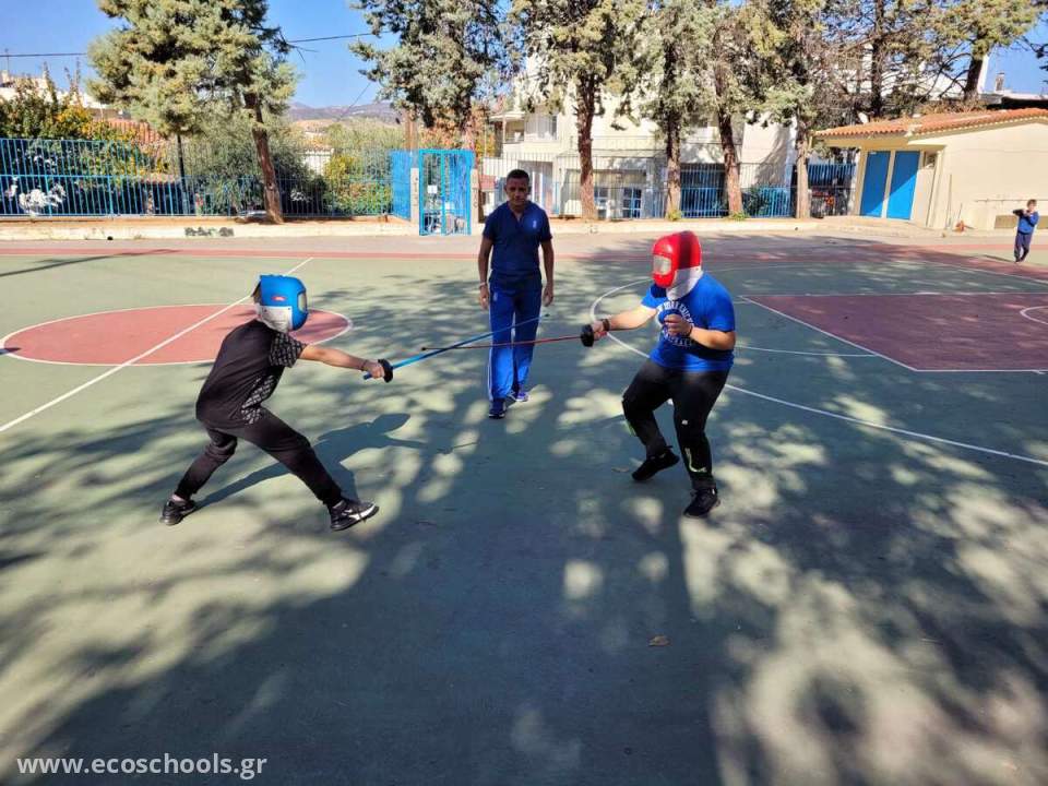 Αργότερα, βγήκαμε στο προαύλιο και κάναμε δραστηριότητες ώστε να πάρουμε μία ιδέα από το άθλημα της ξιφασκίας.