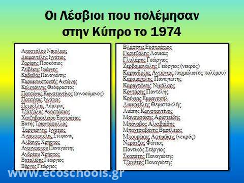 @@ Δύο νεκροί και ένας αγνοούμενος .Αυτός ήταν ο φόρος αίματος που πλήρωσε η Λέσβος στην Κύπρο το 1974. Στον αγώνα κατά του Αττίλα, που ποτίστηκε με το αίμα 2.500 νεκρών και 1619 αγνοουμένων πολέμησαν 39 Λέσβιοι. Από αυτούς γύρισαν πίσω οι 36. Τρείς δεν επέτρεψαν.