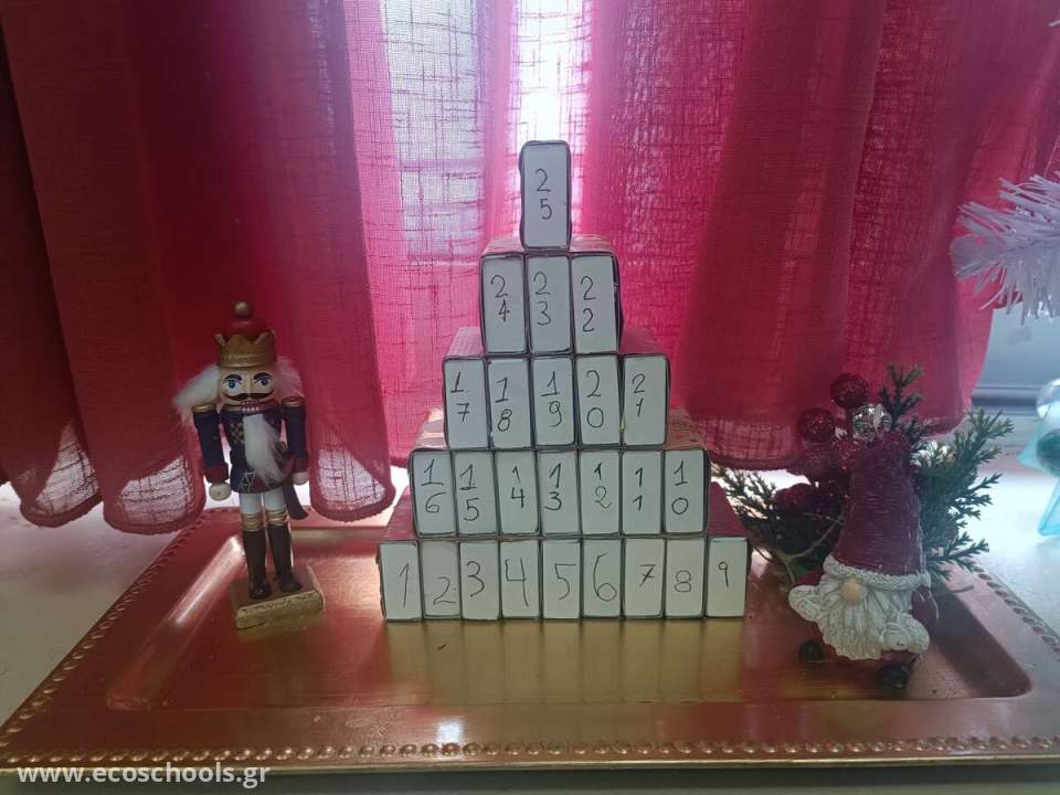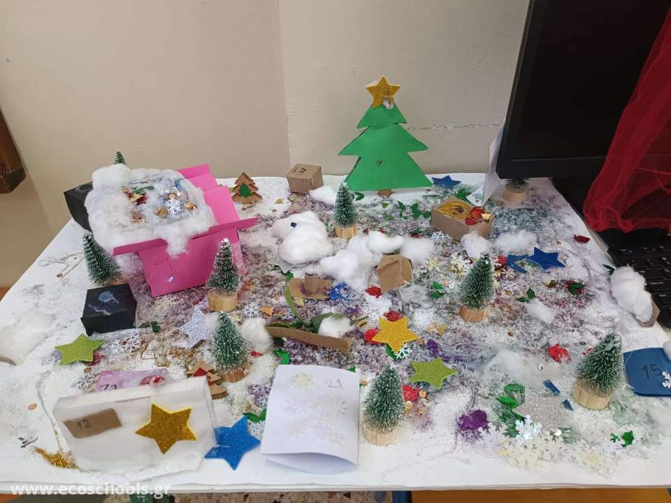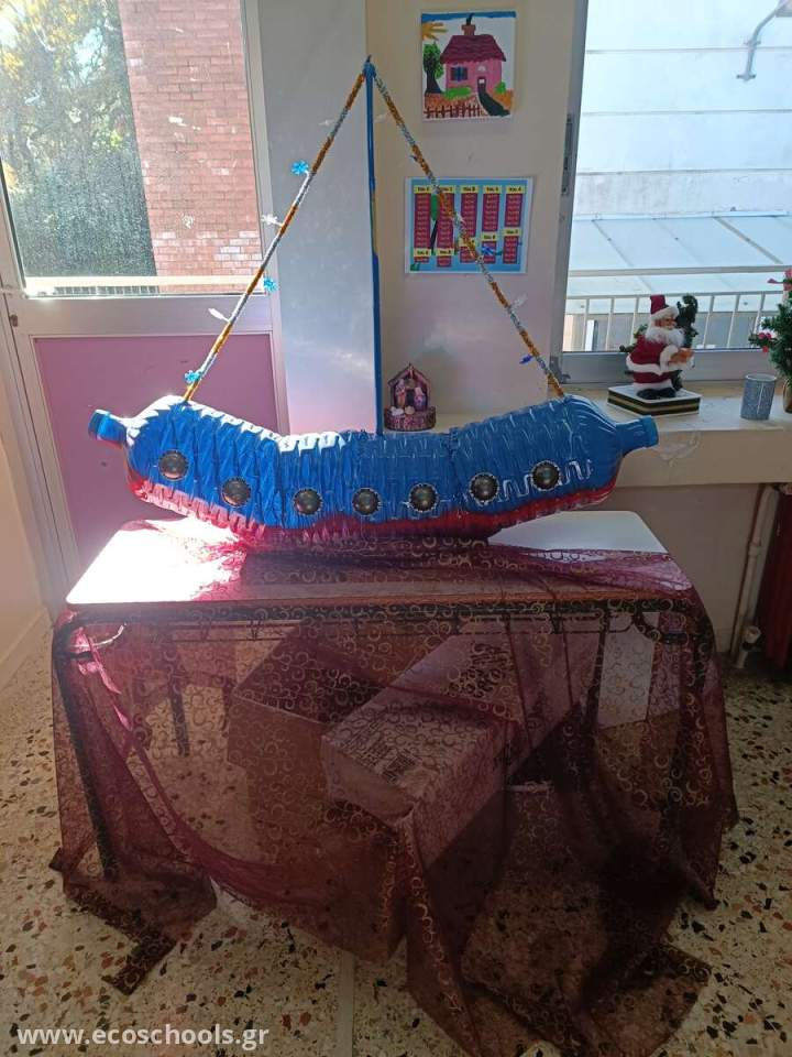 Οι μαθητές τις Ε΄ και ΣΤ' δημοτικού σε συνεργασία με την εκπαιδευτικό Γερμανικών και τον εκπαιδευτικό τάξης αντίστοιχα, δημιούργησαν χριστουγεννιάτικα ημερολόγια κατασκευασμένα από ανακυκλώσιμα υλικά. Η μεγάλη έκπληξη ήρθε από έναν μαθητή της Ε' τάξης, ο οποίος έφτιαξε ένα καράβι- στολίδι για το σχολείο μας. Κατασκευασμένο από πλαστικά μπουκάλια και κάψουλες του καφέ, κόσμησε την τάξη και έκλεψε την παράσταση.