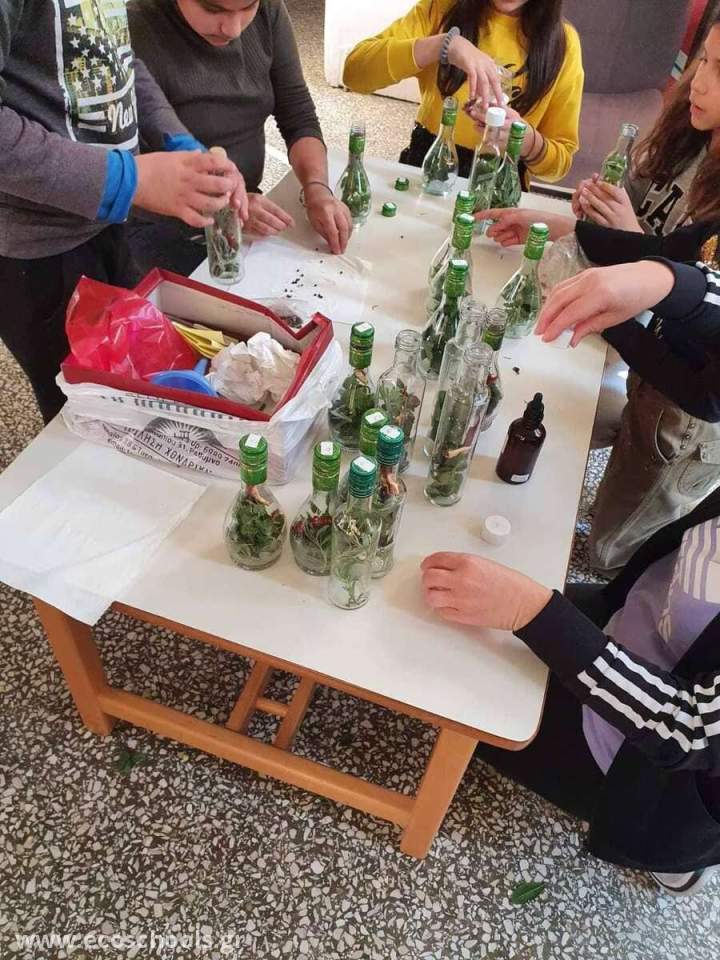 Οι μαθητές του Ομίλου Κηπουρικής γέμισαν μπουκάλια με ελαιόλαδο και βότανα για το χριστουγεννιάτικο παζάρι του Συλλόγου Γονέων.