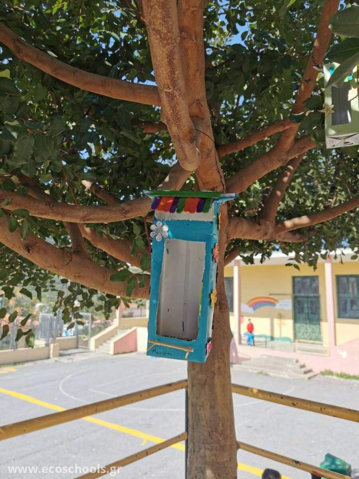 Οι μαθητές/τριες του ΣΤ’1 και ΣΤ’2 στο πλαίσιο του μαθήματος των Εικαστικών δημιούργησαν με ανακυκλώσιμα υλικά ταΐστρες για τους μικρούς φτερωτούς επισκέπτες του σχολείου μας. Πιο συγκεκριμένα, αφού πρώτα συνέλεξαν χάρτινα κουτιά γάλατος ή χυμού και χάρτινες αυγοθήκες τα καθάρισαν καλά από το περιεχόμενό τους και τα έβαψαν. Στη συνέχεια, έκοψαν ένα μέρος τους και έβαλαν μέσα τροφή. Ακολούθως, ως καλοί οικοδεσπότες κρέμασαν τις αυτοσχέδιες ταΐστρες στα δέντρα του σχολείου περιμένοντας με χαρά τους μικρούς επισκέπτες. Έτσι, ο κήπος του σχολείου μας έγινε ακόμα πιο φιλικός για τα πουλιά, αλλά και για εμάς τους ίδιους, που θα ακούμε το όμορφο κελάηδημά τους κάθε φορά που θα μας επισκέπτονται. Αυτό που μένει είναι να γίνουμε παρατηρητές των μικρών επισκεπτών μας. Αν είμαστε τυχεροί ίσως φτιάξουν και φωλιά κοντά μας, έτσι θα έχουμε την ευκαιρία να κάνουμε νέους μικρούς φτερωτούς φίλους!