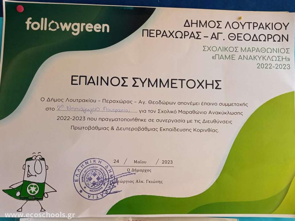 Οι μαθητές και τα σχολεία που συμμετείχαν στον 5ο Σχολικό Μαραθώνιο «Πάμε Ανακύκλωση» του Δήμου Λουτρακίου – Περαχώρας – Αγ. Θεοδώρων, στο πλαίσιο του Followgreen, βραβεύθηκαν την Τετάρτη 24 Μαΐου 2023, σε τελετή που πραγματοποιήθηκε στη Δημοτική Βιβλιοθήκη Λουτρακίου.