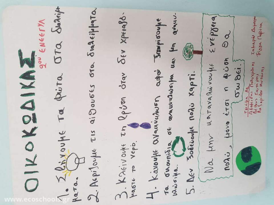 Η περιβαλλοντική μας συμπεριφορά μπορεί να έχει άμεση σχέση με τη μείωση του οικολογικού αποτυπώματος σε επίπεδο σχολείου και όχι μόνο. Γι’αυτό οι μαθητές μας ανέλαβαν δράση και δημιούργησαν οικοκώδικες με δικές τους ιδέες, εργάστηκαν ομαδικά για τη σύνταξή τους και το αποτέλεσμα ήταν υπέροχο. Οι οικοκώδικες αναρτήθηκαν στους διαδρόμους αλλά και σε αίθουσες. Έπειτα, οι μαθητές που συμμετέχουν στη δράση ‘στο δρόμο για ένα οικολογικό σχολείο’ ενημέρωσαν όλα τα τμήματα και τους κάλεσαν να σβήνουν τα φώτα των τάξεων για μια εβδομάδα στη διάρκεια των διαλειμμάτων, με σκοπό τη βελτίωση της περιβαλλοντικής τους συμπεριφοράς.
