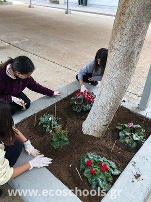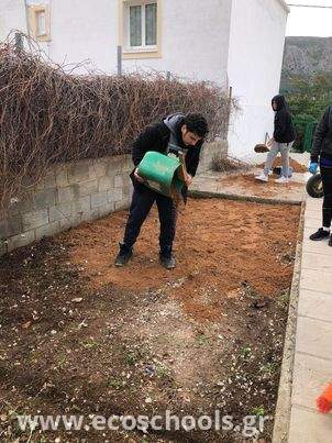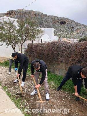 Σε συνέχεια των δράσεων του οικολογικού μας σχολείου, το Σάββατο 4-2-2023, η περιβαλλοντική ομάδα του σχολείου μας συγκεντρώθηκε στο σχολικό χώρο, προκειμένου να περιποιηθεί, να ανανεώσει με νέα φυτά τα παρτέρια μας, να φροντίσει το χώρο που θα μετατραπεί σε λαχανόκηπο , να φιλοτεχνήσει ξύλινες πινακίδες με ονομασίες οικολογικού περιεχομένου, οι οποίες και θα ονοματίσουν τα παρτέρια μας. Στα προσδοκώμενα οφέλη της όλης αυτής προσπάθειας προστίθεται αρχικά η τροφοδοσία του κυλικείου μας με βιολογικά προϊόντα, που θα καλλιεργήσουν οι μαθητές μας, για μια πιο υγιεινή διατροφή των μελών της σχολικής κοινότητας, αλλά και της υιοθέτησης ανάλογων διατροφικών συνηθειών στην καθημερινότητά τους. Κατά δεύτερον, η μαθητική ομάδα ενημερώθηκε από τον αρμόδιο φορέα που προσκλήθηκε για τα ενδημικά είδη των φυτών του νησιού , τις ιδιαίτερες συνθήκες βλάστησης και συντήρησής τους (ποιότητα νερού, εδάφους, λειψυδρία), ώστε εν τέλει η παρεχόμενη αυτή γνώση και εμπειρία να αποτελέσουν εφόδια και για την μετέπειτα ζωή τους ως ενήλικες στο τόπο διαμονής τους.