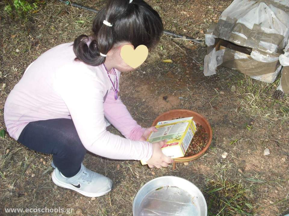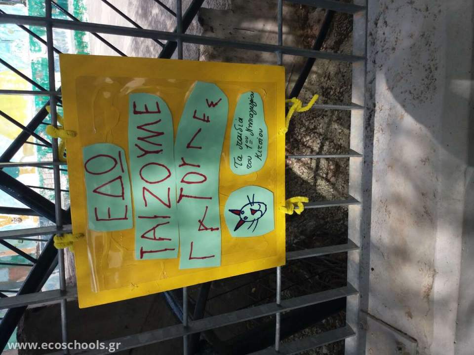 Στα πλαίσια του Σχέδιου Δράσης μας τα παιδιά γίνονται εθελοντές και αναλαμβάνουν να δίνουν τροφή και νερό στις αδέσποτες γάτες της γειτονιάς μας. Τοποθετούν δοχεία για φαγητό και νερό και αναλαμβάνουν να φέρνουν τροφή. Κάθε μέρα δύο εθελοντές γεμίζουν τα δοχεία τα οποία έχουν τοποθετήσει πολύ κοντά στην αυλόποτρα του σχολείου εκεί όπου, όπως διαπιστώσαμε με μεγάλη χαρά κάποιοι άλλοι εθελοντές έφτιαξαν αυτοσχέδια σπιτάκια για τις γατούλες. Τα παιδιά τοποθετούν στο σημείο μια πινακίδα σημείο αναφοράς που σκοπό έχει να ενημερώσει και ίσως να εμπνεύσει.