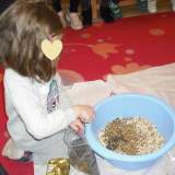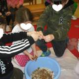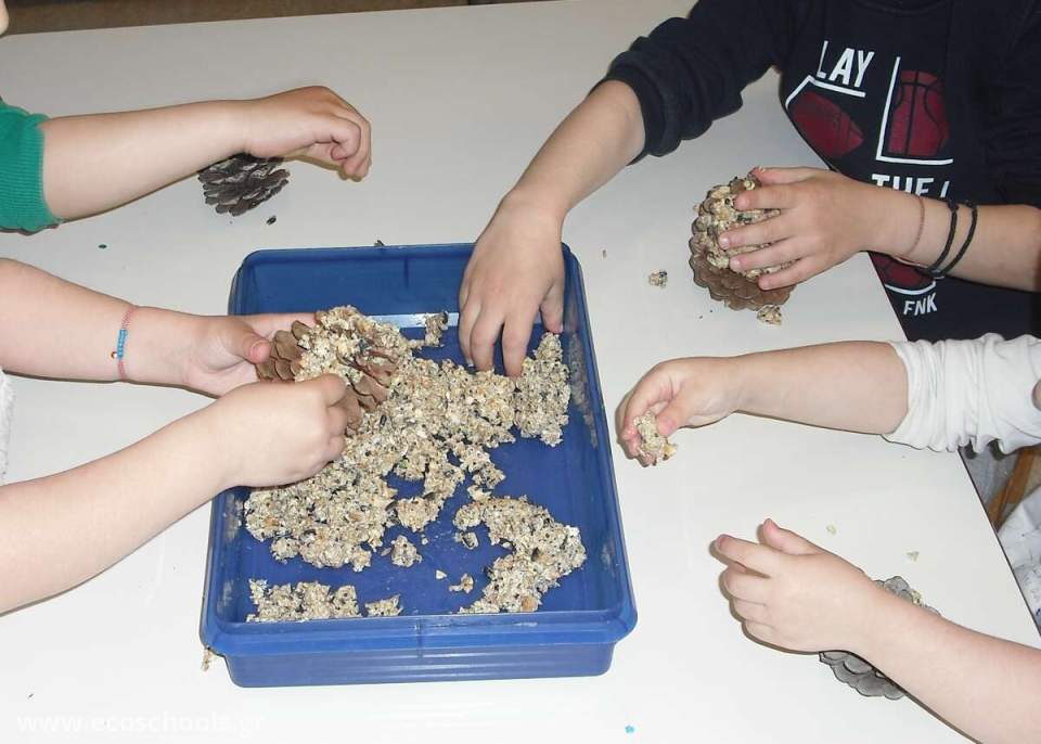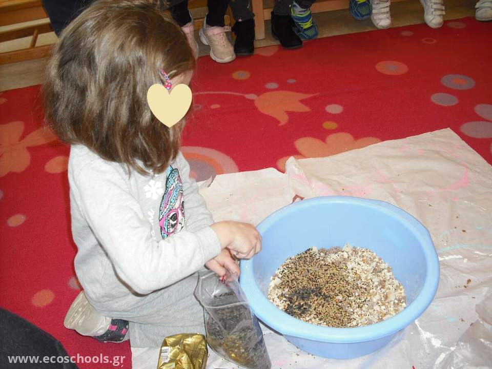 Με την ολοκλήρωση του περιβαλλοντικού ελέγχου τα μέλη της περιβαλλοντικής επιτροπής μίλησαν για τα ευρήματά τους, μοιράστηκαν τις διαπιστώσεις και τις ανησυχίες τους και έκαναν προτάσεις για το Σχέδιο Δράσης του σχολείου μας. Μία από τις προτάσεις να φτιάξουν ταΐστρες για τους φτερωτούς φίλους μας τα πουλιά. Αναζητήσαμε στο διαδίκτυο ιδέες και τελικά αποφασίσαμε να δημιουργήσουμε ταΐστρες με κουκουνάρια που θα γεμίζαμε με ένα μείγμα από σποράκια, ψίχουλα και βρώμη ανακατεμένα με βούτυρο. Τα παιδιά ανέλαβαν να φέρουν τα υλικά και στη συνέχεια έφτιαξαν την τροφή και γέμισαν τα κουκουνάρια. Με μεγάλο ενθουσιασμό κρεμάσαμε τις ταΐστρες στα κάγκελα του νηπιαγωγείου μας κοντά στα κεραμίδια του γειτονικού μας σχολείου καθώς εκεί είχαμε παρατηρήσει τα σπουργίτια να φτιάχνουν τις φωλιές τους. Τοποθετήσαμε και ένα δοχείο με νερό και με μια λαλίτσα καλέσαμε τα πουλιά. Επειδή όμως τα πουλιά τρομάζουν εύκολα με την παρουσία μας τα παρατηρούσαμε από μακριά και τις επόμενες ημέρες με μεγάλη χαρά τα είδαμε να επισκέπτονται τις ταΐστρες μας.