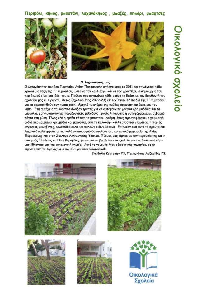 "Πώς θα κάνεις τη διατροφή σου πιο φιλική στο περιβάλλον", "Η σημασία της ανακύκλωσης", "Η παγκόσμια μέρα των Υδροτόπων", "Κοινωνική προσφορά βιολογικών προϊόντων", "Ανυδρία - Ξηρασία" κ.ά. είναι μερικά από τα άρθρα των μαθητών μας.