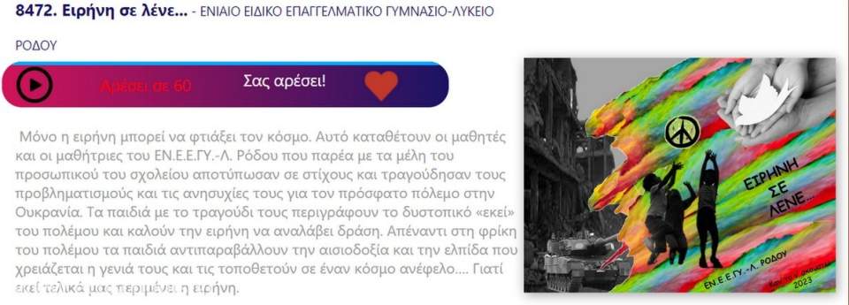 Για δεύτερη συνεχόμενη χρονιά οι μαθητές/τριές του ΕΝΕΕΓΥΛ Ρόδου δημιουργούν και σας τραγουδούν το τραγούδι τους για την Ειρήνη, στον πανελλήνιο διαγωνισμό "Καν' το να ακουστεί 2023".
