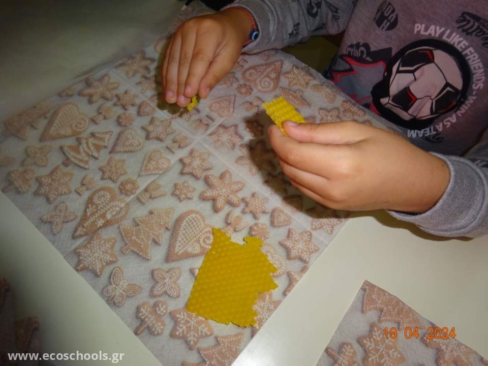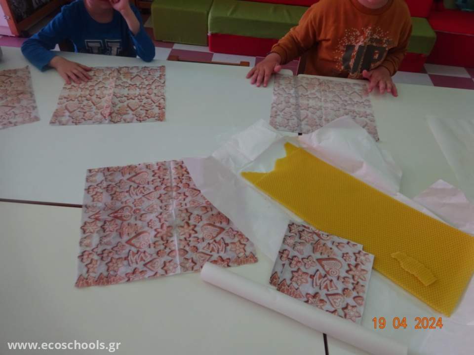 Στο σχολείο μας, κατασκευάσαμε δικά μας κηρομάντηλα, ώστε να διευκολύνουμε τη μείωση των απορριμμάτων και τη συνακόλουθη μείωση του οικολογικού μας αποτυπώματος.