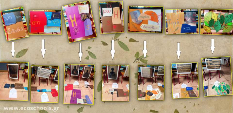 Όλα λοιπόν στήθηκαν σε μια έκθεση στο σχολείο μας για να υποδεχτούμε τους γονείς και να υλοποιήσουμε κι εμείς μια διαφορετική γιορτή με τη συμμετοχή τους. Έτσι λοιπόν ξεκινήσαμε με τις απαραίτητες επεξηγήσεις σχετικά με το έργο του Μποκόρου αλλά και τον τρόπο που θα εργαστούν οι γονείς με τα παιδιά. Ένα χαρτί σε χρώμα φωτεινό θα δεχτεί την σημαία που θα φτιάξουν οι γονείς και πάνω της θα κολλήσουν λουλούδια, ενώ ένα μαύρο χαρτόνι περιμένει να δημιουργηθεί μια σκιά από την παλέτα των Κρητικών αγωνιστών που έχουμε αναρτήσει δίπλα στα έργα του καλλιτέχνη. Κάθε αγωνιστής έχει κάτω από τη φωτογραφία του και μια μικρή περιγραφή της δράσης του.