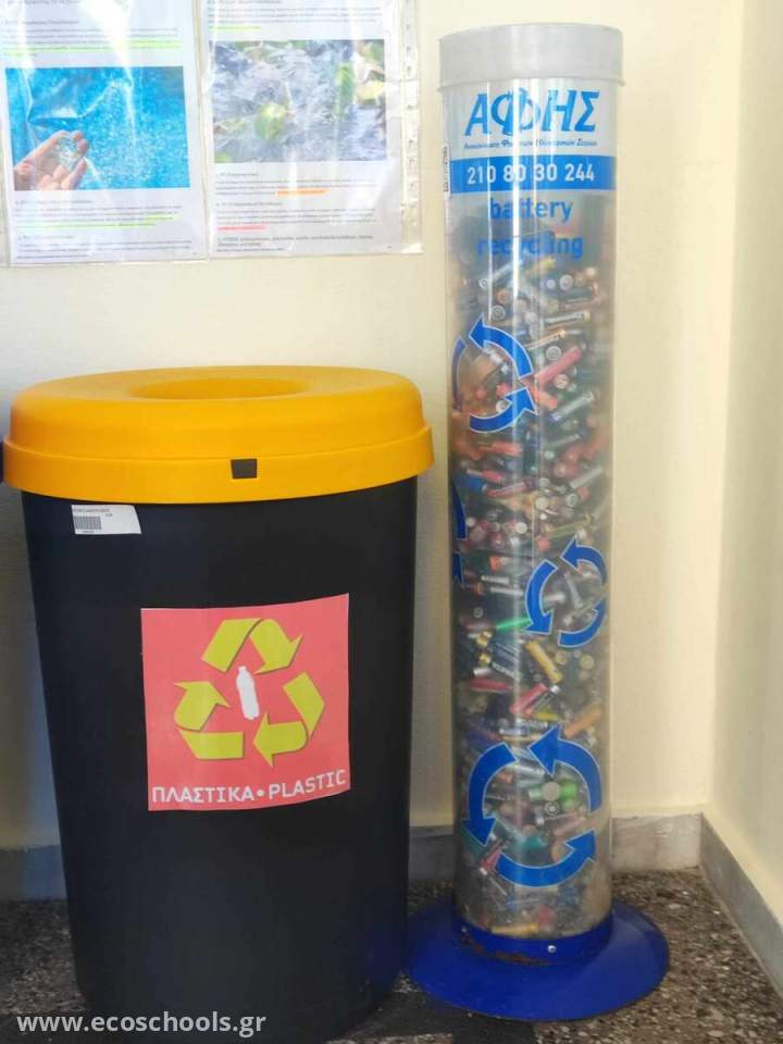 Στο σχολείο μας συλλέγουμε χρησιμοποιημένες ή άδειες μπαταρίες σε ειδικό κάδο ανακύκλωσης μπαταριών Α.Φ.Η.Σ. Όταν η μπαταρία αδειάσει και την πετάξουμε στα σκουπίδια τα βαρέα μέταλλα από τα στραγγίσματα, μολύνουν το έδαφος και τον υδροφόρο ορίζοντα με επικίνδυνες επιπτώσεις για το περιβάλλον και την υγεία του ανθρώπου.Αντίθετα, αν ρίξουμε τις άδειες μπαταρίες στους κάδους ανακύκλωσης της Α.Φ.Η.Σ., ανακυκλώνονται, για να χρησιμοποιηθούν στην παραγωγή νέων μπαταριών ή άλλων προϊόντων και έτσι προστατεύεται το περιβάλλον από ρυπογόνες ουσίες.