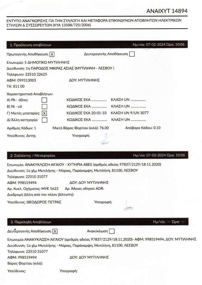 Στο πλαίσιο της δράσης “Ανακύκλωση μπαταριών” στην οποία συμμετέχει το σχολείο μας συγκεντρώθηκαν συνολικά εκατόν εννέα (109) κιλά και τριακόσια (300) γραμμάρια μπαταρίες και παραδόθηκαν (κατά το χρονικό διάστημα από 15/09/2023 έως και 29/02/2024) , στην υπεύθυνη εταιρεία με την επωνυμία «ΑΝΑΚΥΚΛΩΣΗ ΑΙΓΑΙΟΥ – ΧΥΤΗΡΙΑ ΑΒΕΕ»,