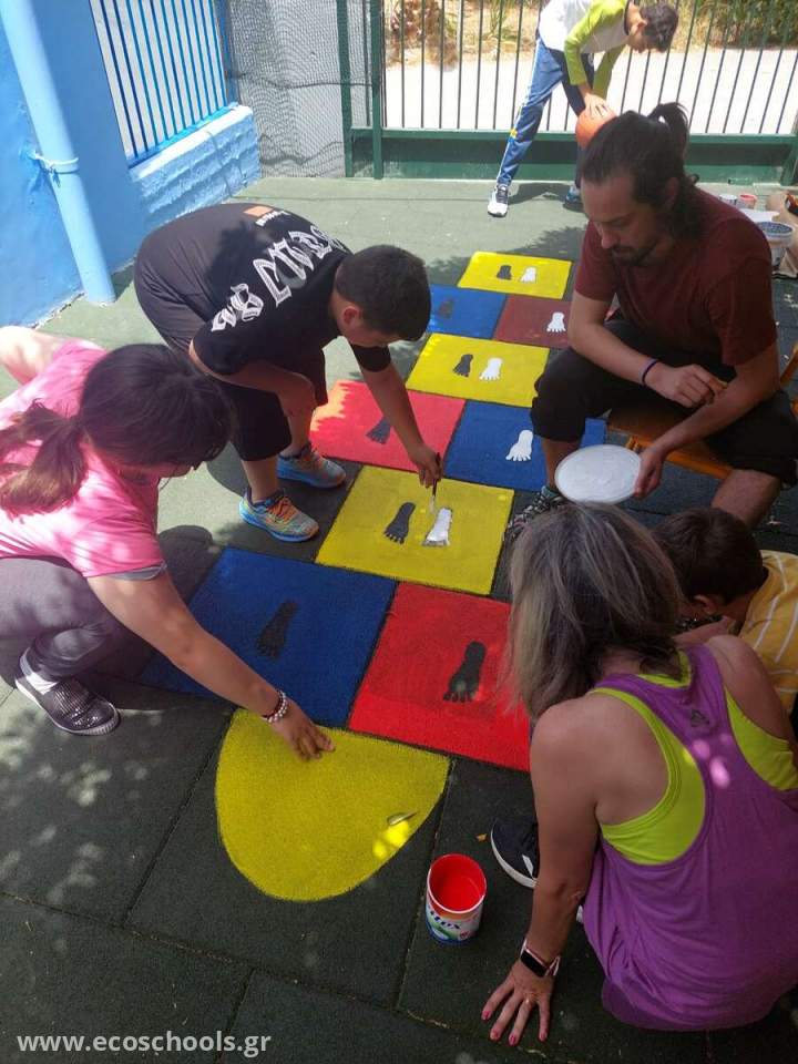 Τέλος ένας ακόμα από τους στόχους που έθεσε η ερευνητική ομάδα ήταν η δημιουργία επιδαπέδιων παιχνιδιών. Ποια παιχνίδια όμως θα ήταν τα ιδανικά; Η πλειοψηφία θεώρησε ότι το κουτσό είναι ένα από τα αγαπημένα παιχνίδια όλων των παιδιών, οπότε αποφασίστηκε αρχικά να δημιουργήσουμε ένα κουτσό. Ένα όμως κουτσό λίγο διαφορετικό....προσαρμοσμένο στις ανάγκες των μαθητών. Αντί για αριθμούς ζωγραφίσαμε πατούσες. Έτσι τα παιδιά μπορούν παίζοντας να μάθουν και τις έννοιες κλειστά-ανοικτά πόδια, δεξί- αριστερό πόδι.