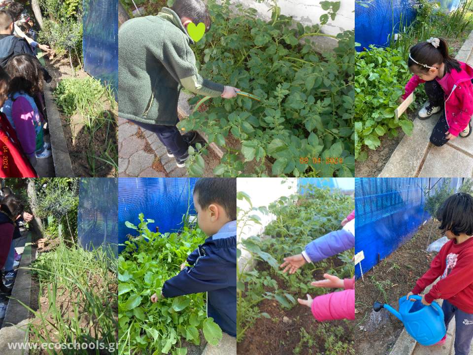 Στα παρτέρια της αυλής τα νήπια έσπειραν πατάτες, κρεμμύδια, ρεπανάκια, μαρούλια. Η φροντίδα, η περιποίηση και η ενασχόληση με τον κήπο έγιναν καθημερινή ανάγκη και ρουτίνα όλων των παιδιών.