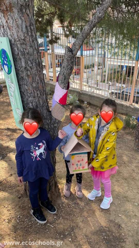 - Κατασκευή ταϊστρών για τα πουλιά. Με ανακυκλώσιμα υλικά όπως χάρτινα κουτιά, αυγοθήκες και διάφορες μεταλλικές και ξύλινες συσκευασίες, τα παιδιά και οι γονείς δημιούργησαν όμορφες ταίστρες για τα πουλιά τις οποίες τοποθετήσαμε στα δέντρα της αυλής μας.