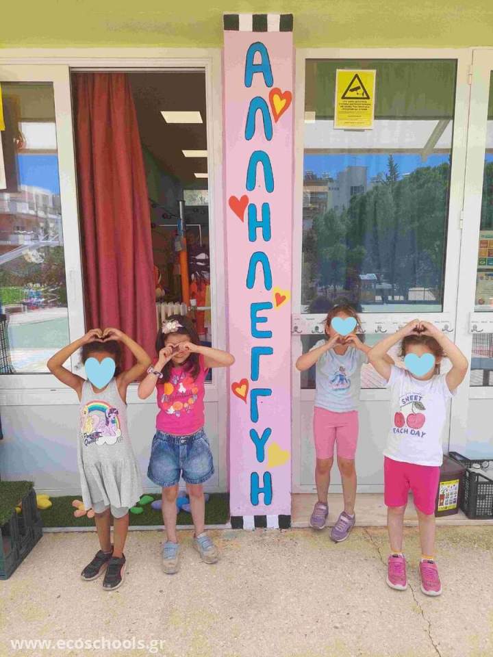 - Κάνω μια αγκαλιά το δέντρο μου. Η αγάπη και η ευγνωμοσύνη για τα δέντρα είναι αληθινή και για αυτό αποφασίσαμε να τους το δείξουμε. Τοποθετήσαμε σε κάθε κορμό μία «αγκαλιά», φτιαγμένη από πολύχρωμα κασκόλ και γάντια/χεράκια, που έφεραν οι μαθητές/τριες στο σχολείο γι αυτό το λόγο.