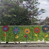- Κάλυψη των κάγκελων με τεχνητή πρασινάδα και στολισμός με λουλούδια από ανακυκλώσιμα υλικά. Zάντες αυτοκινήτων έγιναν λουλούδια γάντια κουζίνας φύλλα, σκουπόξυλα και κοντάρια όμορφα κοτσάνια.