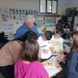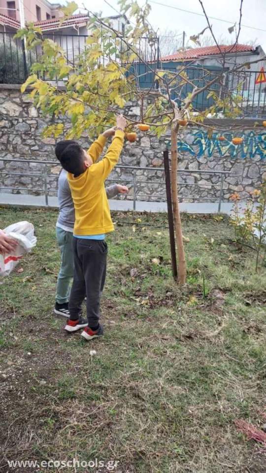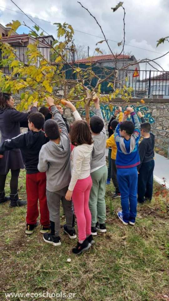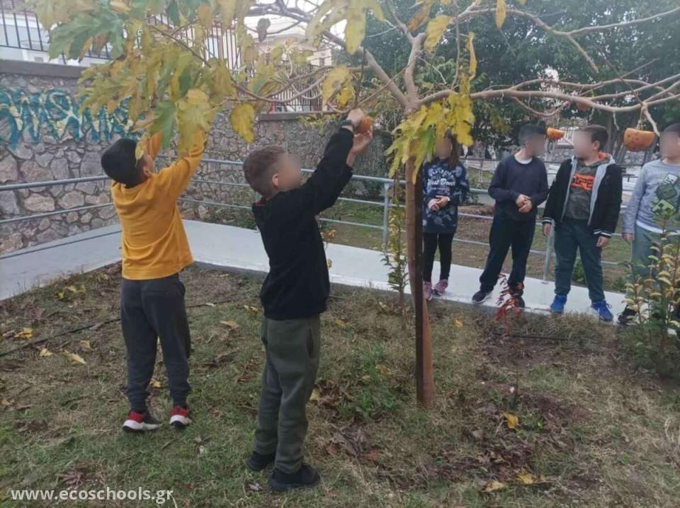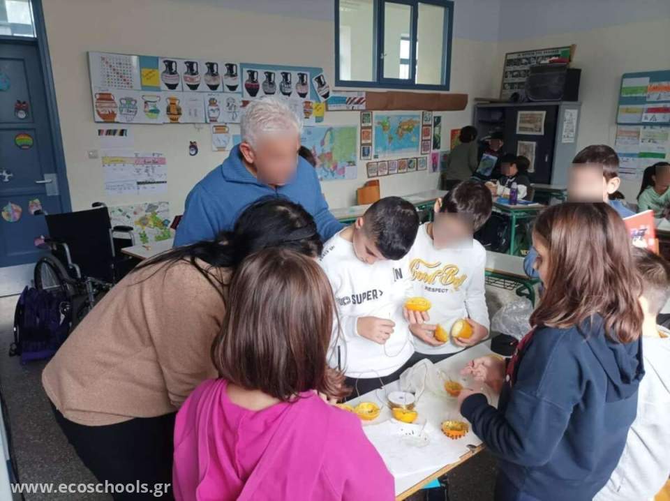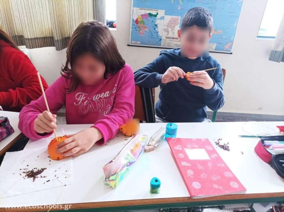 Με κέφι και δημιουργικότητα, οι μαθητές έφεραν πορτοκάλια κομμένα στη μέση, τα άδειασαν προσεκτικά και τα μεταμόρφωσαν σε οικολογικά στολίδια. Κατόπιν διακόσμησαν τη φλούδα τους με γαρίφαλα και με τη βοήθεια ενός αιχμηρού ξύλου άνοιξαν τρύπες για να περάσουν χριστουγεννιάτικη κλωστή. Στη συνέχεια κρέμασαν τα «πορτοκαλένια» τους δημιουργήματα σε δύο δέντρα στην αυλή του σχολείου, γεμίζοντάς τα με σιτάρι, καλαμπόκι και ψίχουλα.