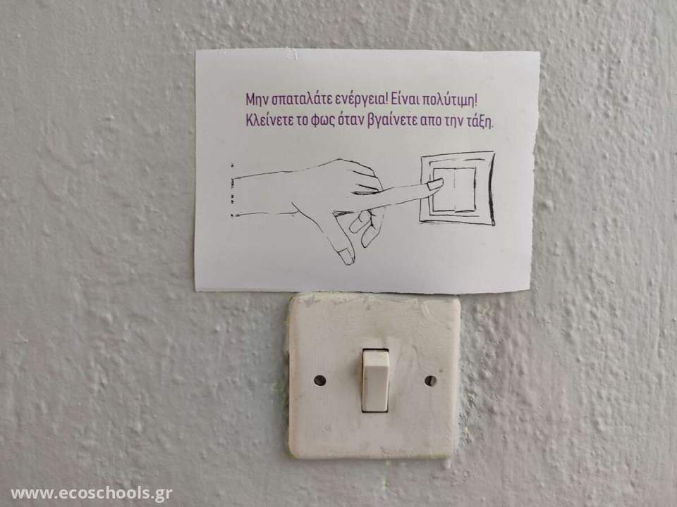 Οι ενεργειακοί επιθεωρητές του σχολείου επικόλλησαν πάνω από τους διακόπτες φωτισμού των αιθουσών, του αμφιθέατρου, των διαδρόμων, των γραφείων διευθυντή και συλλόγου διδασκόντων τη διπλανή ετικέτα σε μια πρώτη προσπάθεια εξοικονόμησης ηλεκτρικής ενέργειας