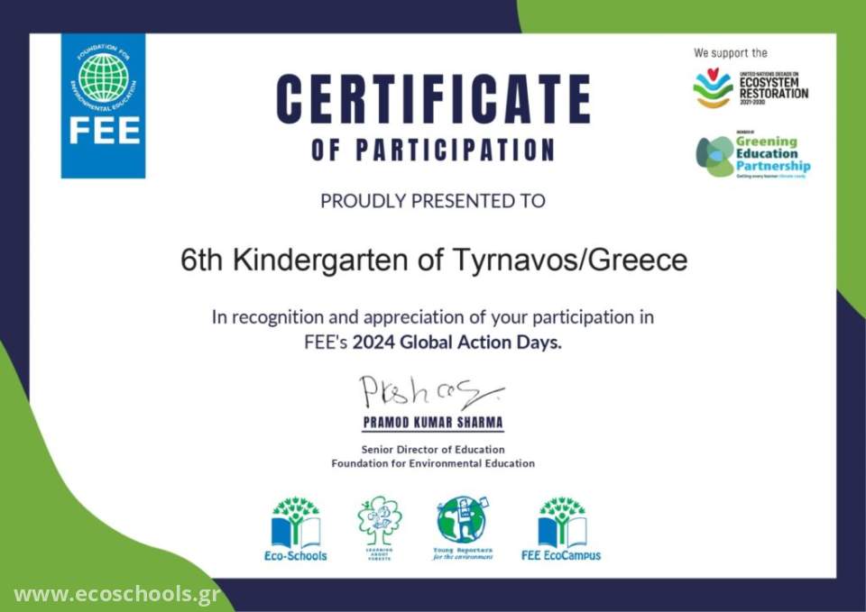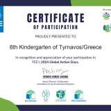 To 6o Νηπιαγωγείο Τυρνάβου, συμμετέχει στις Παγκόσμιες Ημέρες Δράσης 2024 of Foundation for Environmental Education (FEE)