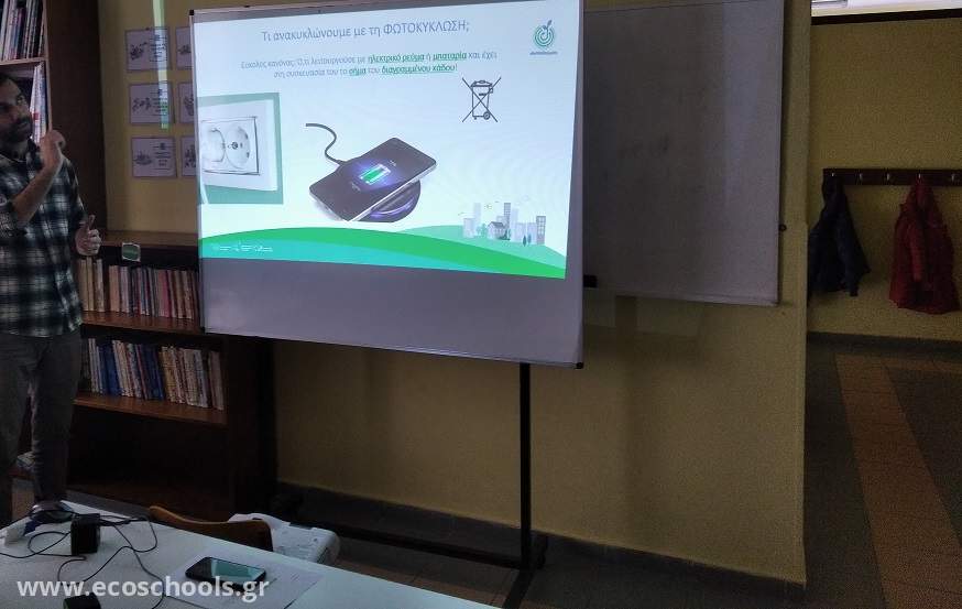 Την Τρίτη 12 Μαρτίου επισκέφτηκε το σχολείο μας επιστημονικός συνεργάτης της Φωτοκύκλωσης, του αρμόδιου φορέα για την οργάνωση της εναλλακτικής διαχείρισης αποβλήτων όλων των ειδών Ηλεκτρικού & Ηλεκτρονικού Εξοπλισμού, στα πλαίσια της ενασχόλησής μας με θέματα ενέργειας.
