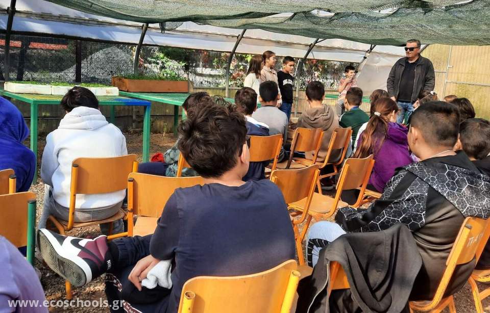 Εντός του θερμοκηπίου έχουμε διαμορφώσει τον χώρο με καρέκλες έτσι ώστε οι μαθητές και οι μαθήτριες να παρακολουθούν και μαθήματα κηπουρικής σε θεωρητικό επίπεδο.