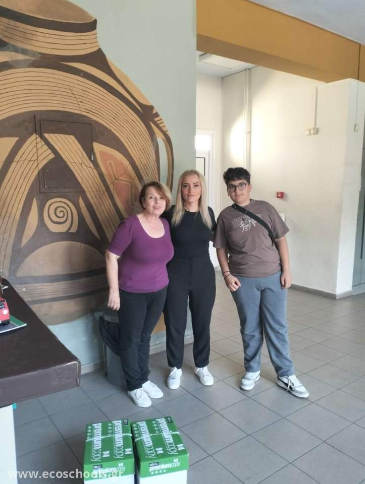 Αρωγός στην προσπάθειά μας αυτή από την πρώτη στιγμή στάθηκε η κυρία Τόνια Κουτσού από την εταιρεία Recycling Central Hellas Α.Ε., που φρόντισε να παραληφθεί το ανακυκλώσιμο υλικό από το σχολείο, να ζυγιστεί στις εγκαταστάσεις της εταιρείας και να μας εφοδιάσει με το χαρτί εκτύπωσης που αντιστοιχούσε στο καθαρό του βάρος!
