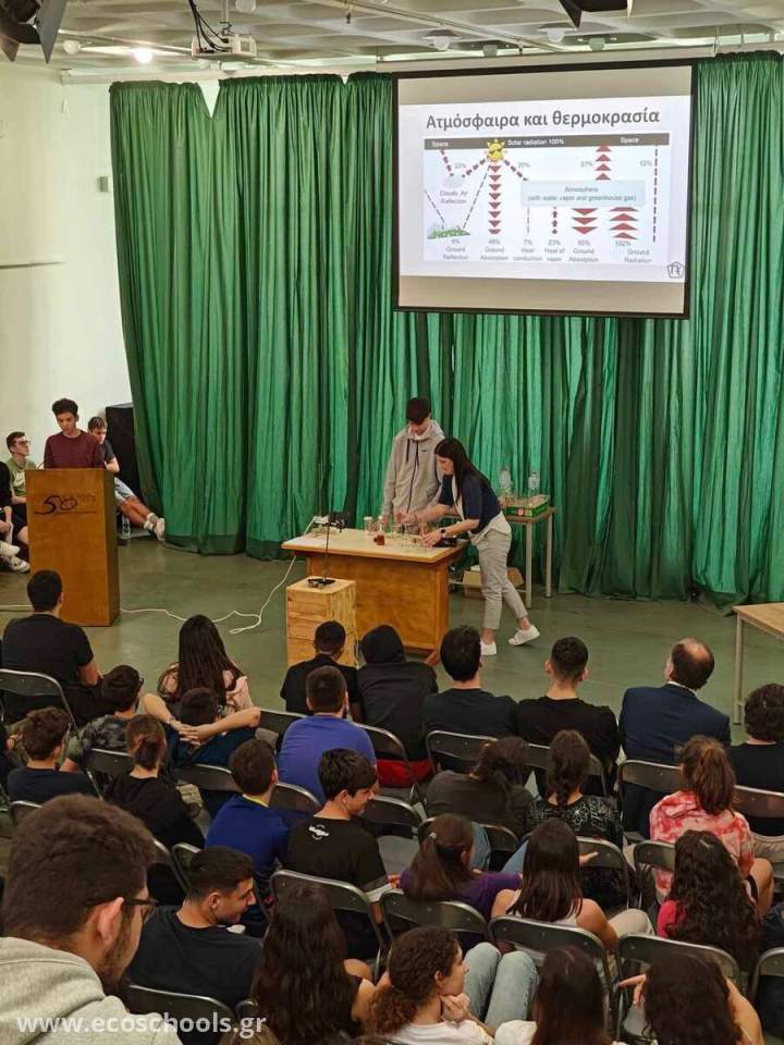 Η Ημέρα Θετικών Επιστημών έκλεισε με την παρουσίαση του θέματος «Ανθρώπινη δραστηριότητα και κλιματική αλλαγή» από τις Περιβαλλοντικές ομάδες του σχολείου, με επιβλέπουσα την καθηγήτρια Θεοδώρα Κοπτερίδου. Οι μαθητές και μαθήτριες των περιβαλλοντικών ομάδων του Γυμνασίου και του Λυκείου του Εκπαιδευτηρίου “ΤΟ ΠΑΓΚΡΗΤΙΟΝ” παρουσίασαν πειράματα σε σχέση με το κλίμα και την ανθρωπογενή κλιματική αλλαγή. Η εργασία τους πραγματοποιήθηκε με αφορμή τη συμμετοχή τους στις δράσεις του εθνικού εκπαιδευτικού προγράμματος «Μαθαίνοντας και Διδάσκοντας για την Κλιματική Αλλαγή, EDU4CLIMA» που υλοποιήθηκε από το «Εργαστήριο Χημικών και Περιβαλλοντικών Διεργασιών» του τμήματος Χημείας του Πανεπιστημίου Κρήτης, στον Φινοκαλιά Λασιθίου.