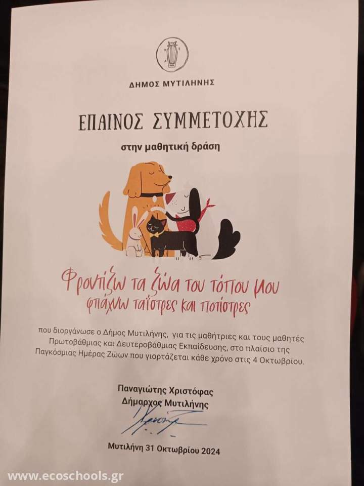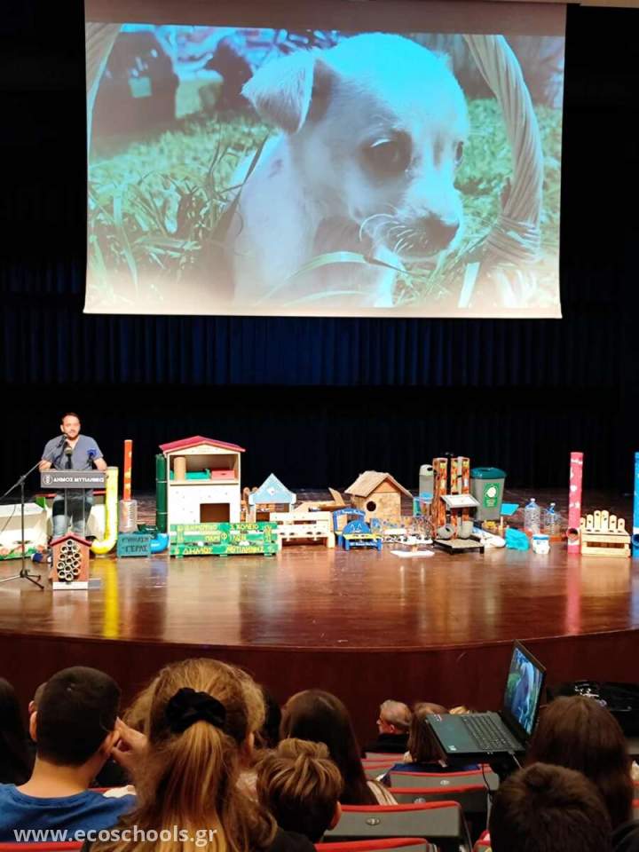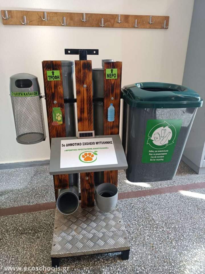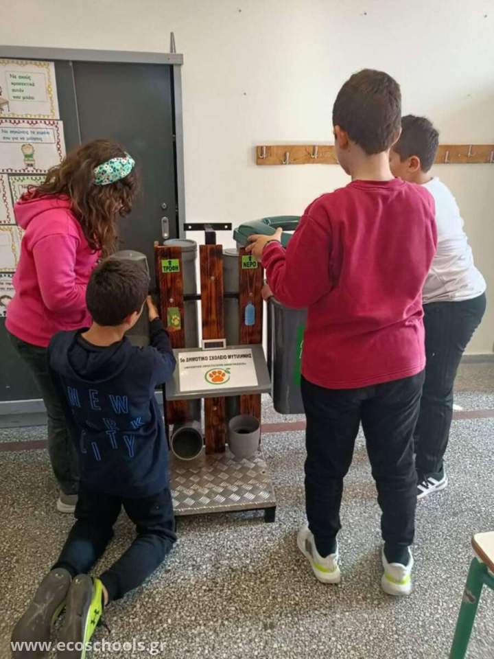 Με αφορμή την Παγκόσμια Ημέρα των Ζώων, οι μαθητές/τριες της ΣΤ1 τάξης του σχολείου μας ανταποκρίθηκαν στο κάλεσμα του Δήμου Μυτιλήνης και ανέλαβαν μια πρωτότυπη δράση, δημιουργώντας μια έξυπνη και λειτουργική ταΐστρα-ποτίστρα με οικολογικό σχεδιασμό για τα αδέσποτα ζώα της περιοχής, η οποία παρουσιάστηκε από τους ίδιους την Πέμπτη 31 Οκτωβρίου 2024 στο Δημοτικό Θέατρο Μυτιλήνης. Η κατασκευή σχεδιάστηκε με στόχο να τοποθετηθεί σε κάποιο σημείο της πόλης μας για να καλύψει τις βασικές ανάγκες των ζώων (νερό και φαγητό). Συγχρόνως, ο σχεδιασμός της ταΐστρας -ποτίστρας προάγει την ανακύκλωση και την Περιβαλλοντική Ευαισθητοποίηση, καθώς έχουν ενσωματωθεί κάδοι για την ανακύκλωση καπακιών και πλαστικών.