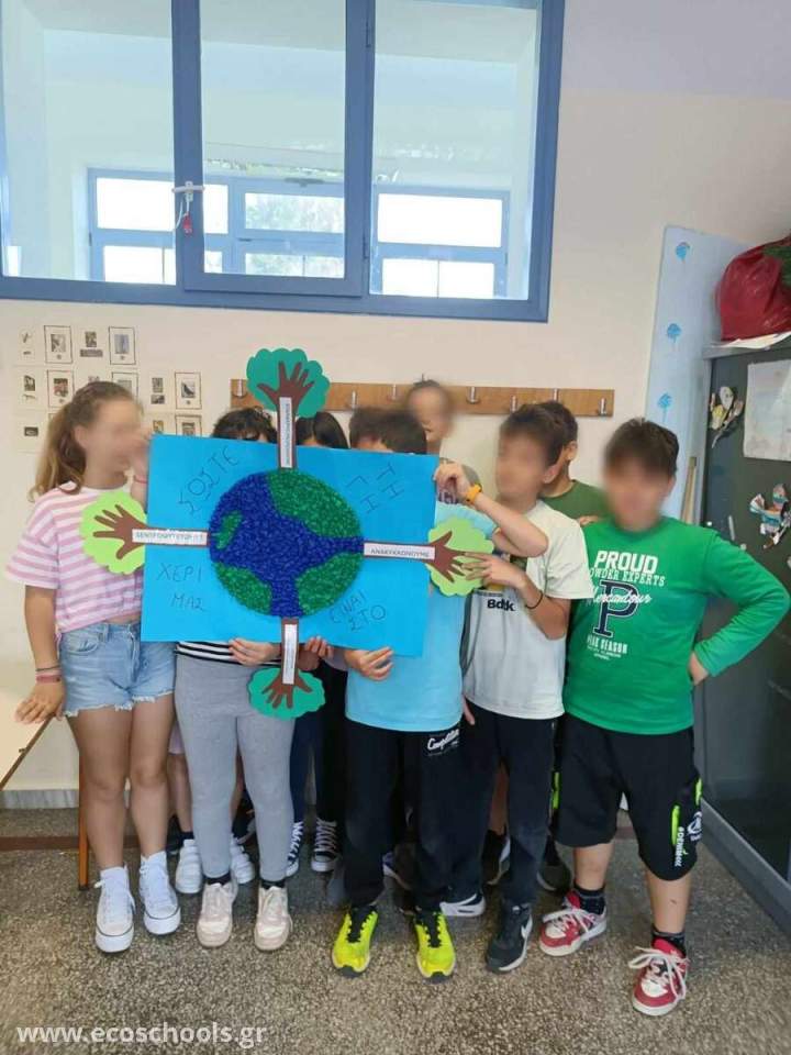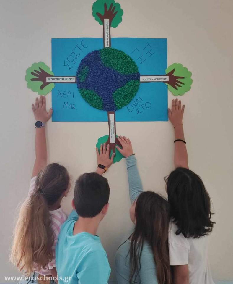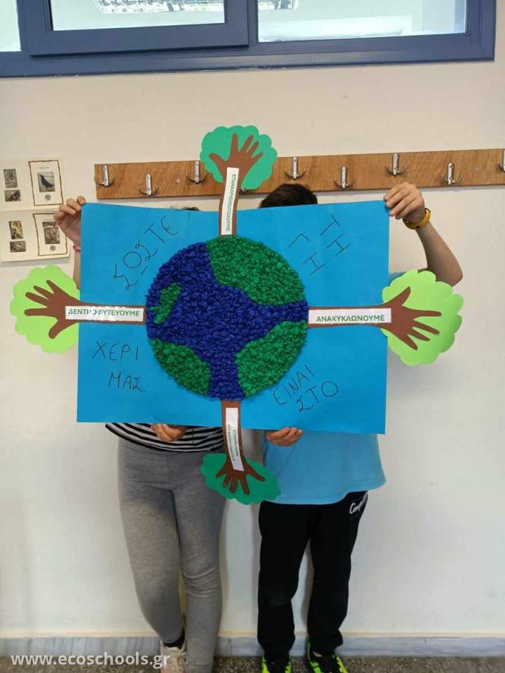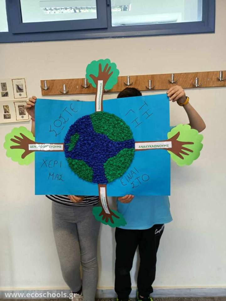 Οι μαθητές/τριες της Ε1 τάξης κατασκεύασαν ένα πρωτότυπο ψηφιδωτό για να ενημερώσουν και να ευαισθητοποιήσουν τη σχολική κοινότητα σε θέματα υιοθέτησης νέων συνηθειών όπως Μείωση, Επαναχρησιμοποίηση, Εξοικονόμηση, Ανακύκλωση και Δεντροφύτευση για την Προστασία του Περιβάλλοντος. Για την κατασκευή του ψηφιδωτού τα παιδιά αξιοποίησαν ανακυκλώσιμα υλικά και έγραψαν το σύνθημα « ΣΩΣΤΕ ΤΗ ΓΗ …ΕΙΝΑΙ ΣΤΟ ΧΕΡΙ ΜΑΣ» τονίζοντας με αυτόν τον τρόπο την ευθύνη ,αλλά και την υποχρέωση των ανθρώπων για την επιτακτική ανάγκη αλλαγής τρόπου και στάσης ζωής για την προστασία του περιβάλλοντος. Στο ψηφιδωτό απεικονίζεται η Γη και γύρω της δέντρα με κορμούς που συμβολίζονται με ανθρώπινα χέρια τονίζοντας με αυτόν τον τρόπο ότι την ευθύνη για την προστασία του περιβάλλοντος την έχει ο άνθρωπος.