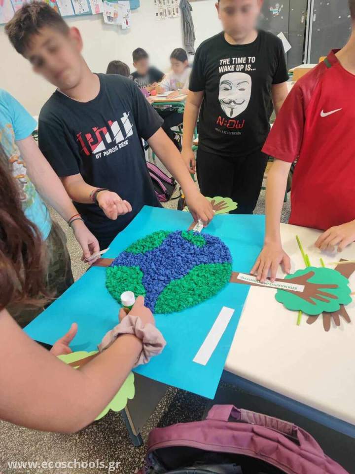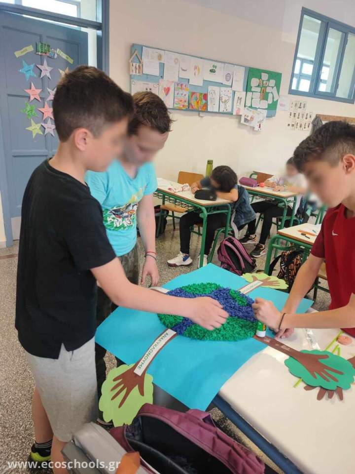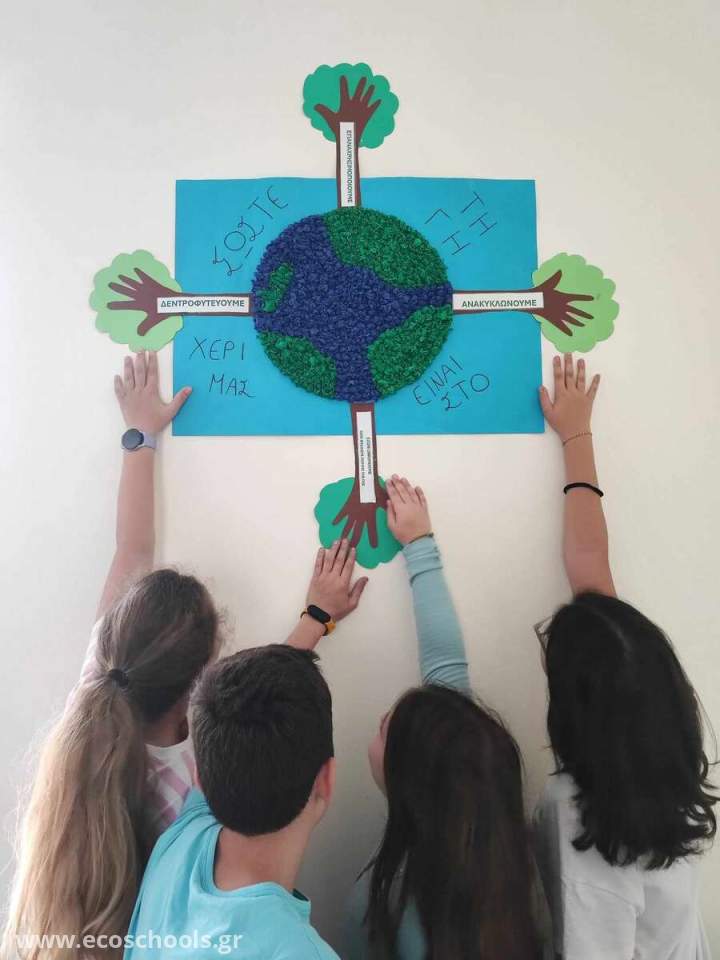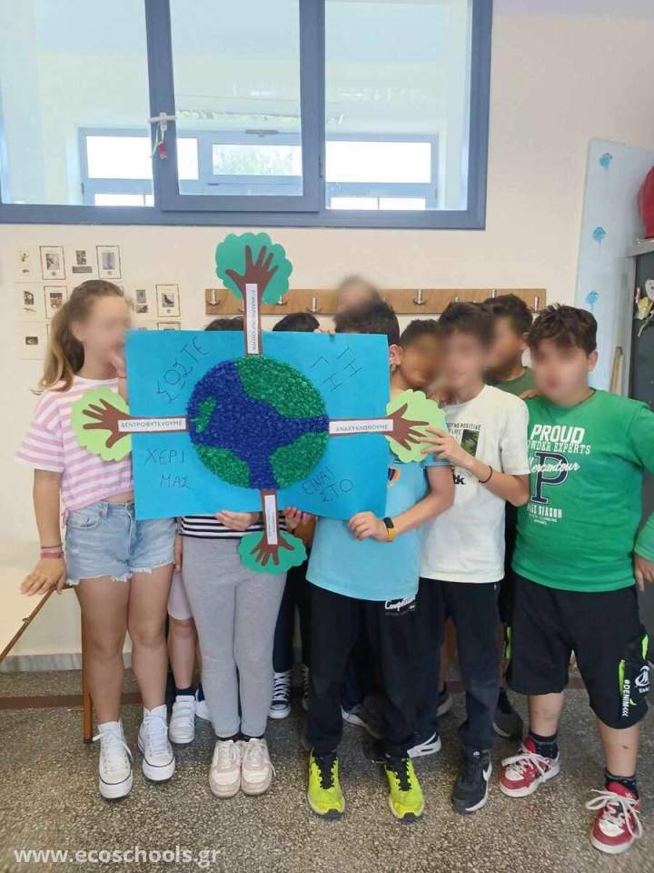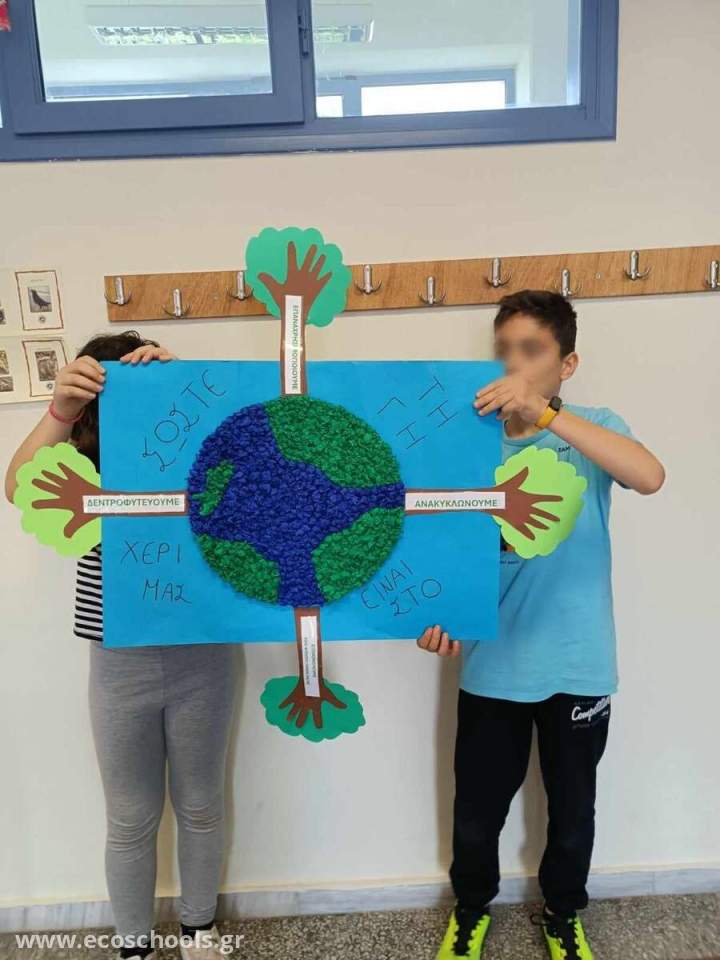 Οι μαθητές/τριες της Ε1 τάξης κατασκεύασαν ένα πρωτότυπο ψηφιδωτό για να ενημερώσουν και να ευαισθητοποιήσουν τη σχολική κοινότητα σε θέματα υιοθέτησης νέων συνηθειών όπως Μείωση, Επαναχρησιμοποίηση, Εξοικονόμηση, Ανακύκλωση και Δεντροφύτευση για την Προστασία του Περιβάλλοντος. Για την κατασκευή του ψηφιδωτού τα παιδιά αξιοποίησαν ανακυκλώσιμα υλικά και έγραψαν το σύνθημα « ΣΩΣΤΕ ΤΗ ΓΗ …ΕΙΝΑΙ ΣΤΟ ΧΕΡΙ ΜΑΣ» τονίζοντας με αυτόν τον τρόπο την ευθύνη ,αλλά και την υποχρέωση των ανθρώπων για την επιτακτική ανάγκη αλλαγής τρόπου και στάσης ζωής για την προστασία του περιβάλλοντος. Στο ψηφιδωτό απεικονίζεται η Γη και γύρω της δέντρα με κορμούς που συμβολίζονται με ανθρώπινα χέρια τονίζοντας με αυτόν τον τρόπο ότι την ευθύνη για την προστασία του περιβάλλοντος την έχει ο άνθρωπος.