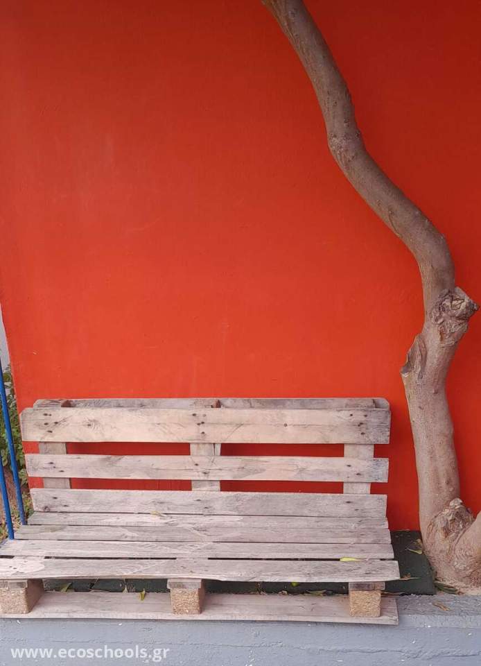 Μετά από σκέψη της ερευνητικής ομάδας για το πώς να δημιουργήσουμε καθίσματα για τους μαθητές του σχολείου που προαυλίζονται, η πρόταση του διευθυντή του σχολείου μας, μας φάνηκε ιδανική. Δημιουργία καθισμάτων από παλέτες. Με τη βοήθεια του μουσικού του σχολείου μας ο οποίος εκτός των άλλων είναι και καλός μάστορας, δημιουργήσαμε 3 υπέροχα καθίσματα από παλέτες. Τώρα οι μαθητές μας χαίρονται να κάθονται σε αυτές την ώρα του διαλείμματος και να απολαμβάνουν τη σκιά του δέντρου.