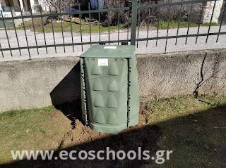 Η διαδικασία αυτή περιλαμβάνει τη χρήση ειδικών κάδων στους οποίους τοποθετούνται τα οργανικά υλικά και μετατρέπονται σε πολύ καλής ποιότητας λίπασμα. Έτσι το σχολείο μας, φρόντισε για την προμήθεια ενός κάδου κομποστοποίησης , ο οποίος τοποθετήθηκε στο πίσω μέρος της αυλής.