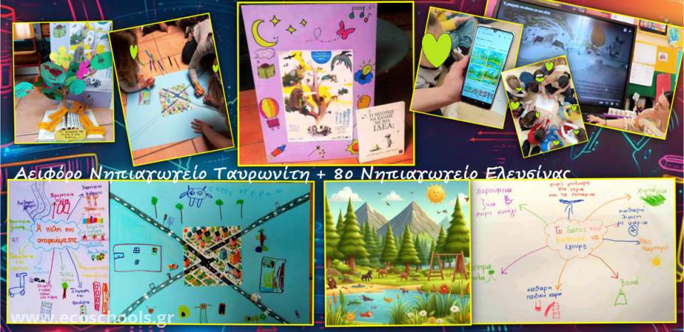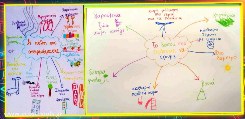 Ακολούθησε καταιγισμός ιδεών γύρω από την κεντρική ιδέα. Το δικό μας νηπιαγωγείο οραματίστηκε μια πόλη και το 8ο Νηπιαγωγείο Ελευσίνας ένα δάσος... Τα επιμέρους πολλά και ενδιαφέροντα!