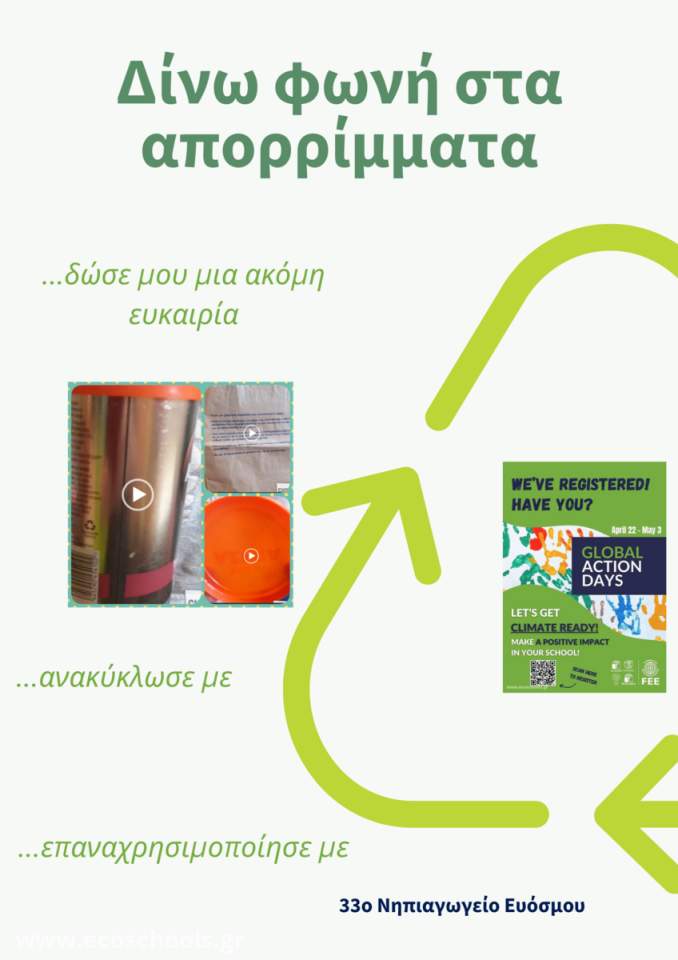 Το θέμα της διαχείρισης των απορριμμάτων αποτελεί βασικό στόχο του Σχεδίου δράσης του νηπιαγωγείου μας για την φετινή χρονιά. Παράλληλα θέλοντας να συμμετέχουμε στις Παγκόσμιες Ημέρες Δράσης (GAD) , μια 10ήμερη εκστρατεία που ενώνει τα σχολεία να συνεργαστούν σε ουσιαστικές πρωτοβουλίες για ένα βιώσιμο μέλλον, οργανώσαμε την δράση του σχολείου μας.