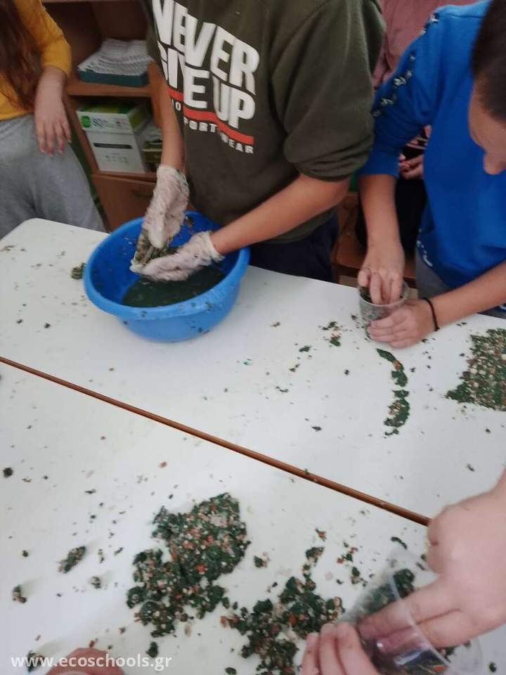 Προετοιμάζοντας την κατασκευή του παρτεριού μας, σκεφτήκαμε να ετοιμάσουμε το μικρό μας φυτώριο. Πώς θα το κάνουμε όμως περισσότερο οικο…συστημικό; Σε συνεργασία με τους γονείς σκεφτήκαμε τις βιο-γλάστρες αξιοποιώντας τα  υλικά τοπικής επιχείρησης που φτάνουν στα σκουπίδια.
