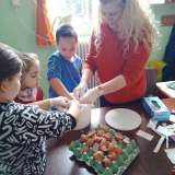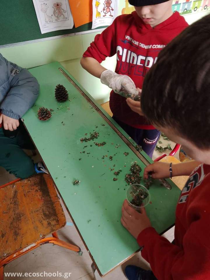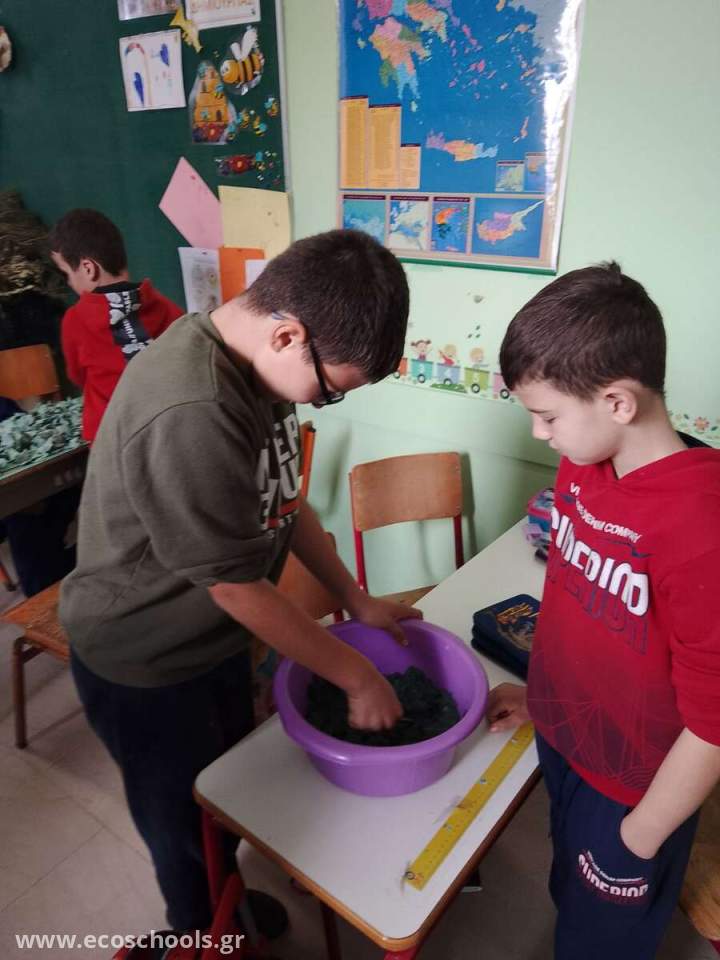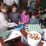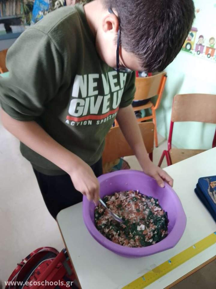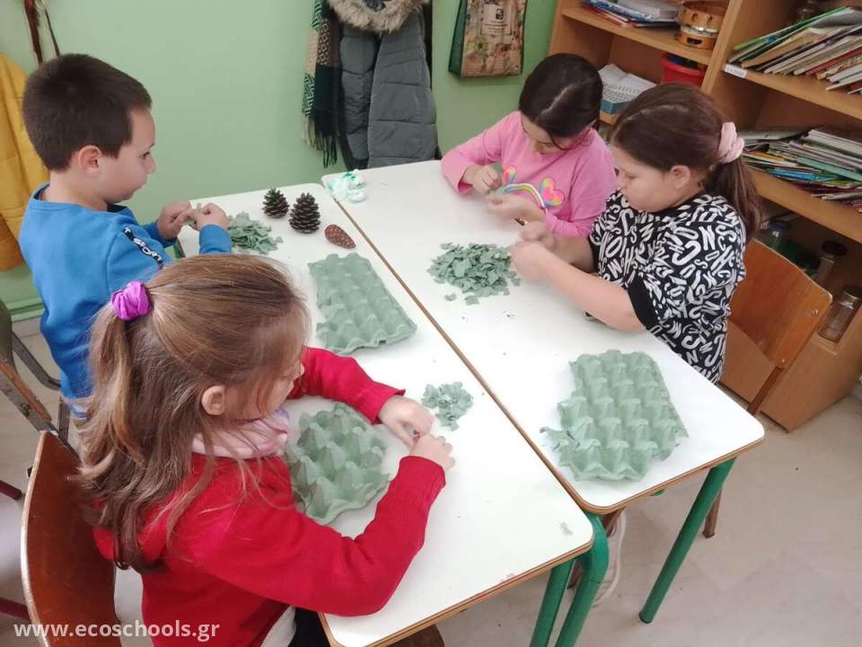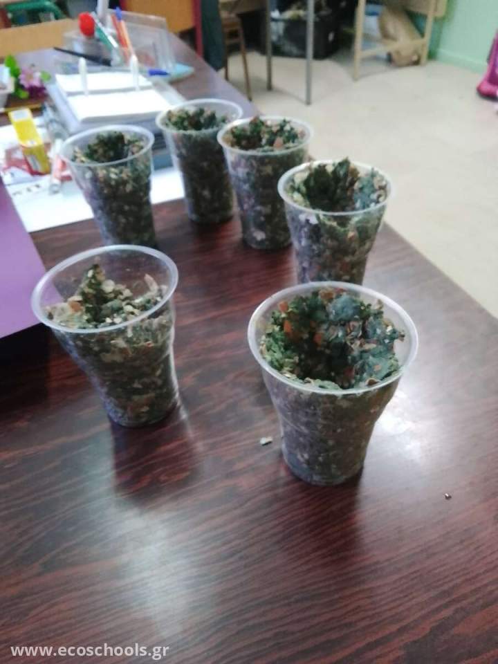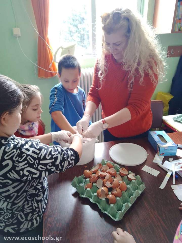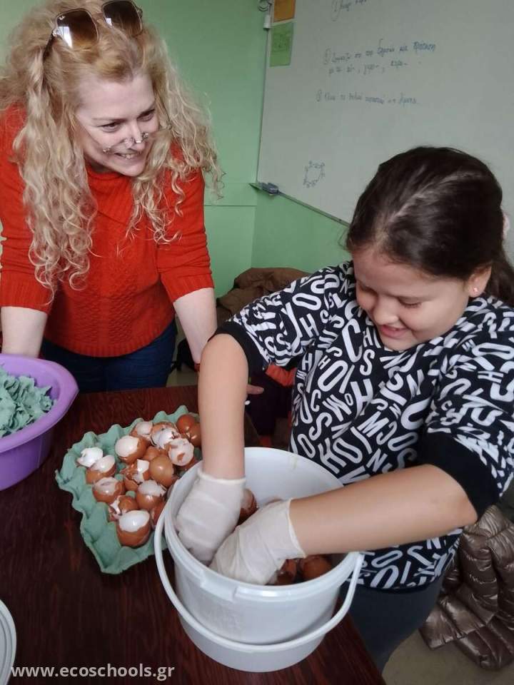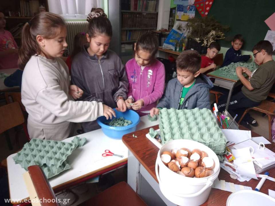 Δεσμεύσαμε την κ. Στ. Μ,. μητέρα παιδιών του σχολείου που εργάζεται στην τοπική επιχείρηση παρασκευής εδεσμάτων, να μας προμηθεύσει τις χάρτινες αυγοθήκες και τα τσόφλια των αυγών μιας ημέρας.