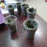 Ξεκινήσαμε δουλειά! Κόψαμε σε μικρά κομματάκια τα τις αυγοθήκες. Τις πολτοποιήσαμε με ζεστό νερό. Σπάσαμε σε μικρά κομματάκια τα τσόφλια των αυγών. Τα αναμείξαμε με το πολτοποιημένο χαρτί και «χτίσαμε» τις γλάστρες μας σε πλαστικά καλούπια.