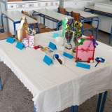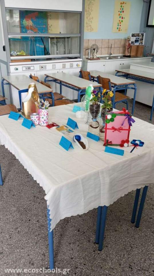 Στα εκθέματα συμπεριλήφθηκαν κοστούμια της θεατρικής παράστασης του σχολείου μας «Ένα ζευγάρι φτερά, παρακαλώ» από ανακυκλωμένα υλικά: μάσκες, σακούλες απορριμμάτων, σακούλες από πατατάκια, χαρτί υγείας, χαρτί από περιοδικά και εφημερίδες κ.τ.λ, που ανακατασκεύασαν οι μαθητές φέτος. Επίσης, οι μαθητές με την καθοδήγηση της κ. Κόγιας Μαρία κατασκεύασαν αντικείμενα γραφείου, γλάστρες, δοχείο θερμού, φτυάρια καθώς και κάρτες από πλαστικά μπουκάλια, μπουκάλια απορρυπαντικών, κουτιά από πατατάκια και καπάκια. Ακόμη,