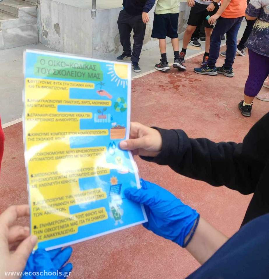 Στο πλαίσιο συμμετοχής του σχολείου μας στο Δίκτυο Περιβαλλοντικής Εκπαίδευσης – Οικολογικά σχολεία οι μαθητές /τριες της Δ΄ τάξης κατόπιν διαλογικής συζήτησης δημιούργησαν σε μορφή αφίσας τον Οικοκώδικα του Σχολείου μας. Μια σειρά οδηγιών/κανόνων περιβαλλοντικής συμπεριφοράς με στόχο την αειφορία. Με τον οικοκώδικα οι μαθητές/τριες δεσμεύτηκαν ως “Προστάτες του περιβάλλοντος” να καταβάλλουν συλλογική προσπάθεια για τον σκοπό αυτό.