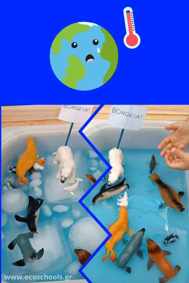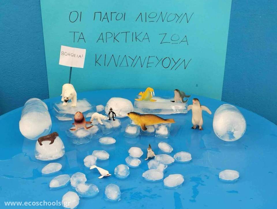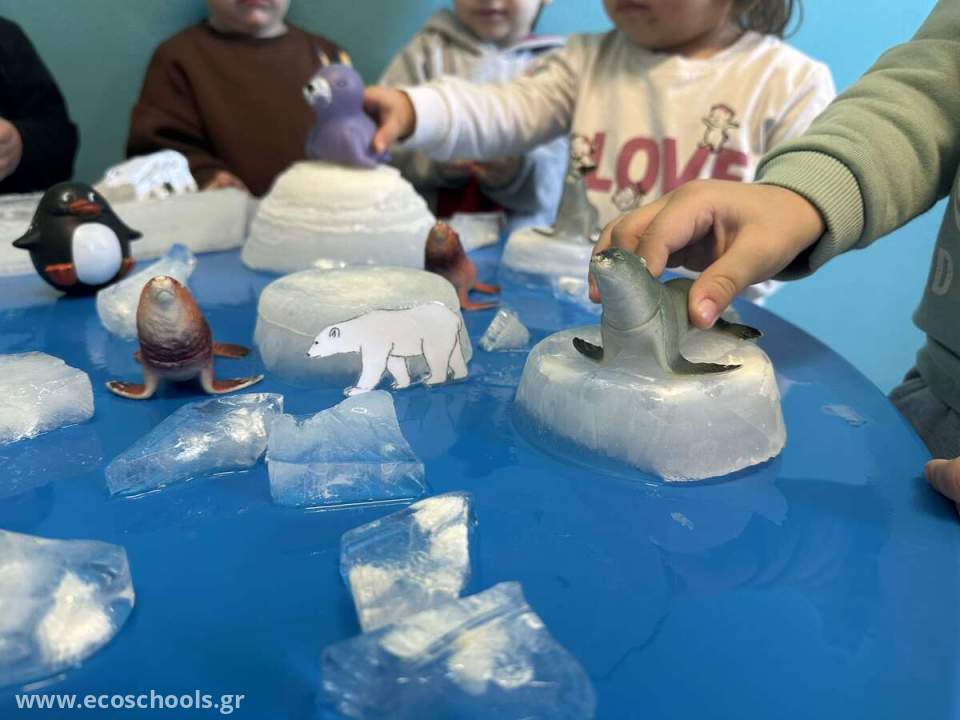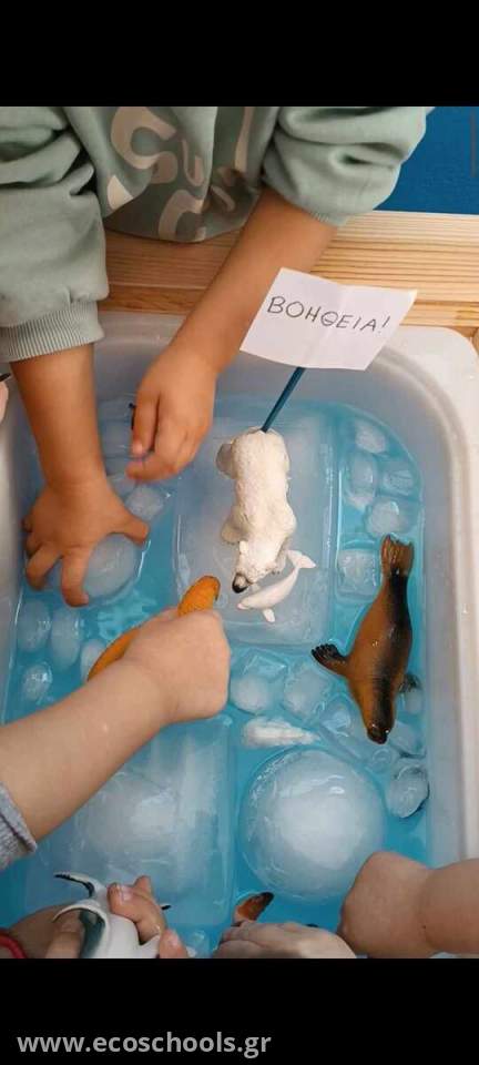 Οι μαθητές των βρεφικών τμημάτων του σχολείου μας, προσέγγισαν ένα απο τα σημαντικότερα Οικολογικά ζητήματα, μέσω αισθητηριακού παιχνιδιού και της βιωματικής μάθησης. Άγγιξαν, αισθάνθηκαν και παρατήρησαν πως λιώνει το "σπίτι" των αρκτικών ζώων. Τα παιδιά μέσα από την πράξη, συνειδητοποίησαν τις συνέπειες που θα προκαλέσει το λιώσιμο των πάγων. Πρότειναν λύσεις, απλές αλλά και περίπλοκες, βασισμένοι στην παιδική τους αθωότητα.