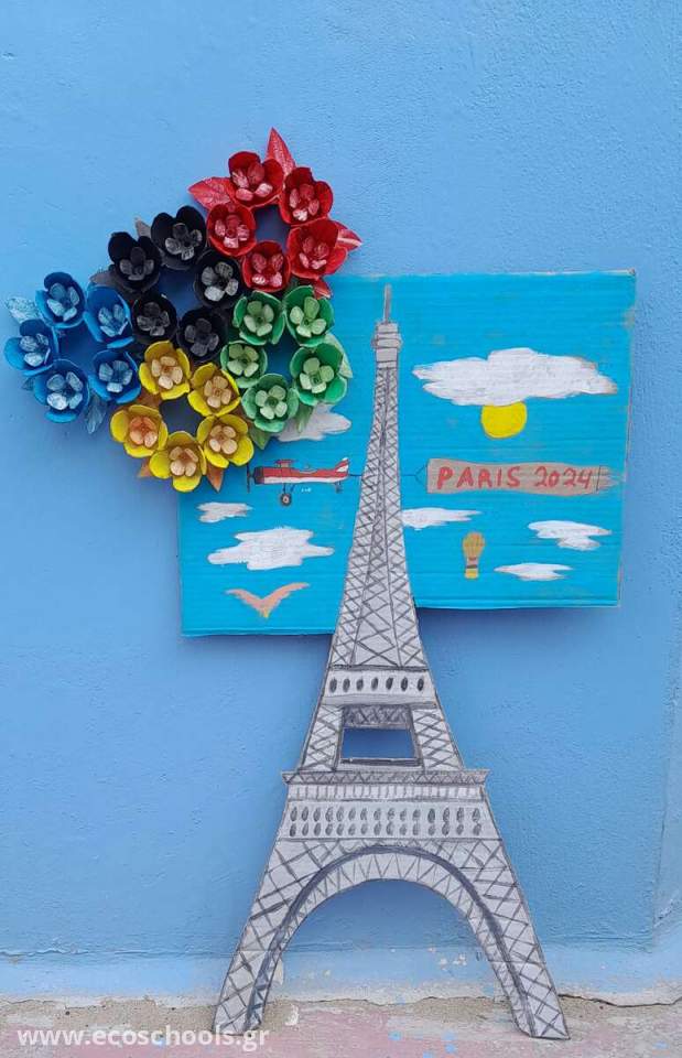Με έμπνευση τους Ολυμπιακούς Αγώνες που θα γίνουν φέτος στο Παρίσι δημιουργήσαμε μια υπέροχη κατασκευή από ανακυκλώσιμα υλικά (χαρτόκουτα και χάρτινες αυγοθήκες) για τη συμμετοχή μας στο διαγωνισμό του Δήμου Ηρακλείου στον οποίο συμμετέχουν σχολεία, στέλνοντας εικαστικές δημιουργίες, φτιαγμένες αποκλειστικά από ανακυκλώσιμα υλικά.